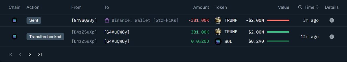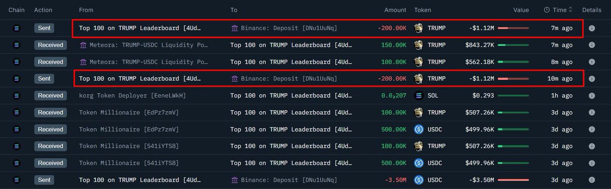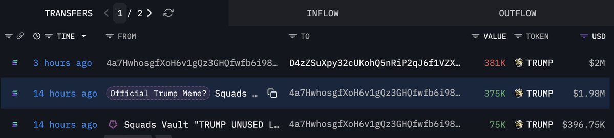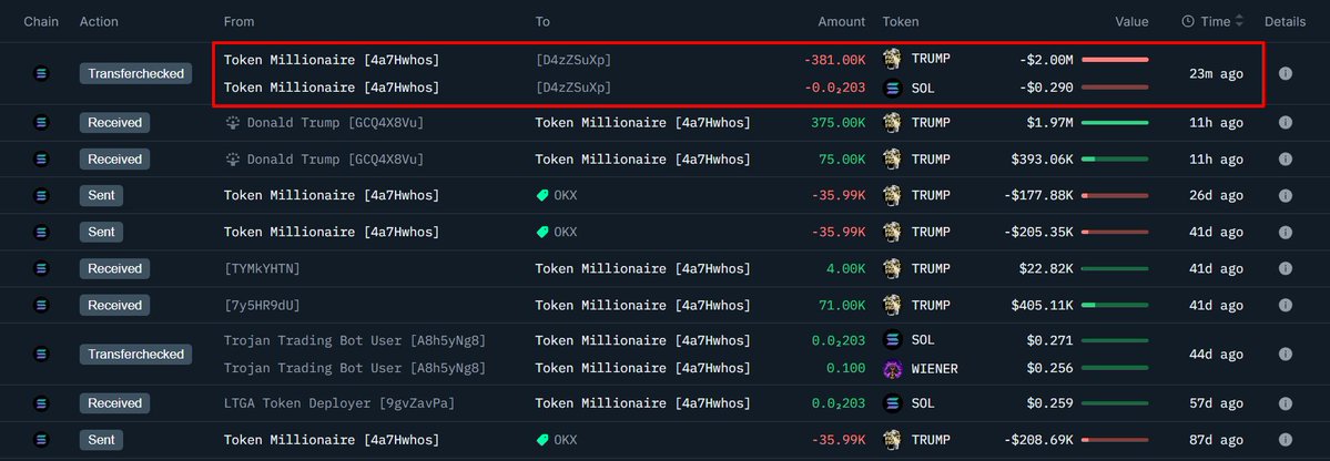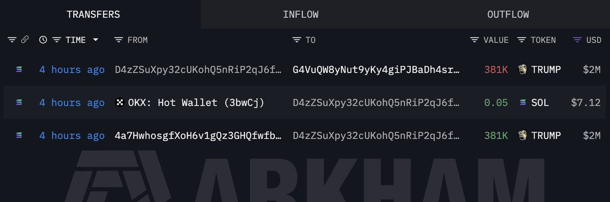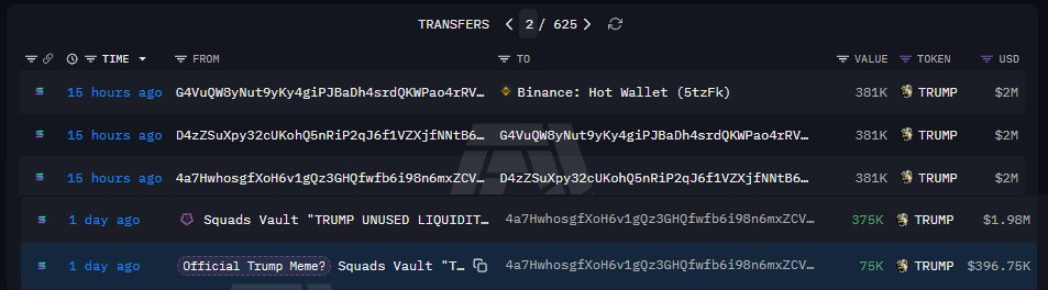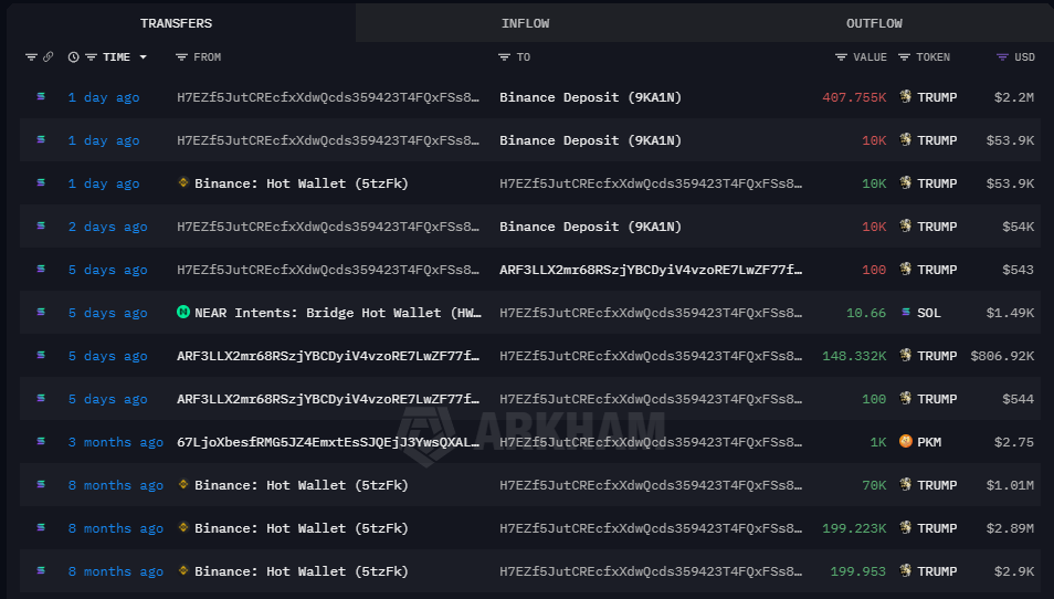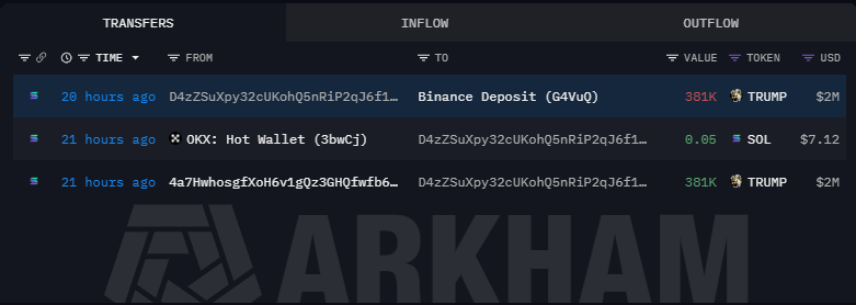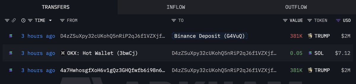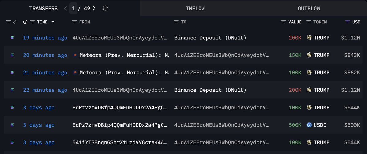 LookonChain标记了一个与TRUMP团队相关的钱包,该钱包在过去几小时内向Binance存入了价值200万美元的381K $TRUMP。