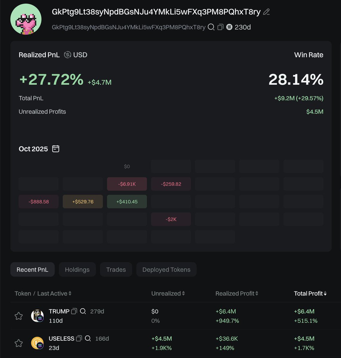 • 在 Hyperliquid 上,他存入了485,669 $USDC 并使用最大杠杆做多113万 $TRUMP(950万美元),未实现利润现在为118万美元。