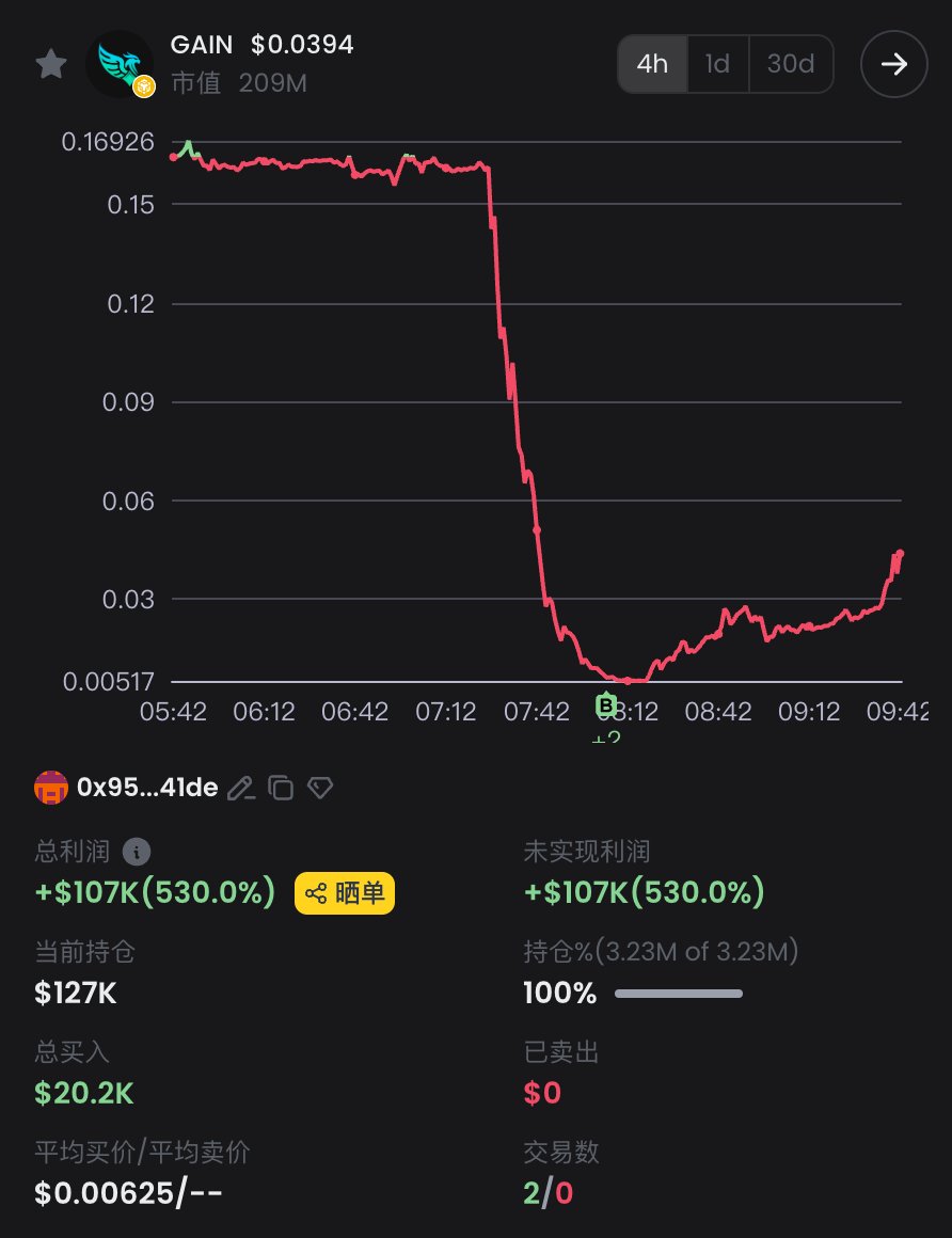 刀尖舔血一号选手 0x951...141de 几乎买在了 $GAIN 短期最底部 以均价 $0.00625 买入了 2.02 万美元,一小时浮盈 10.7 万美元了,回报率 530%,暂时还没有卖出动作🙌