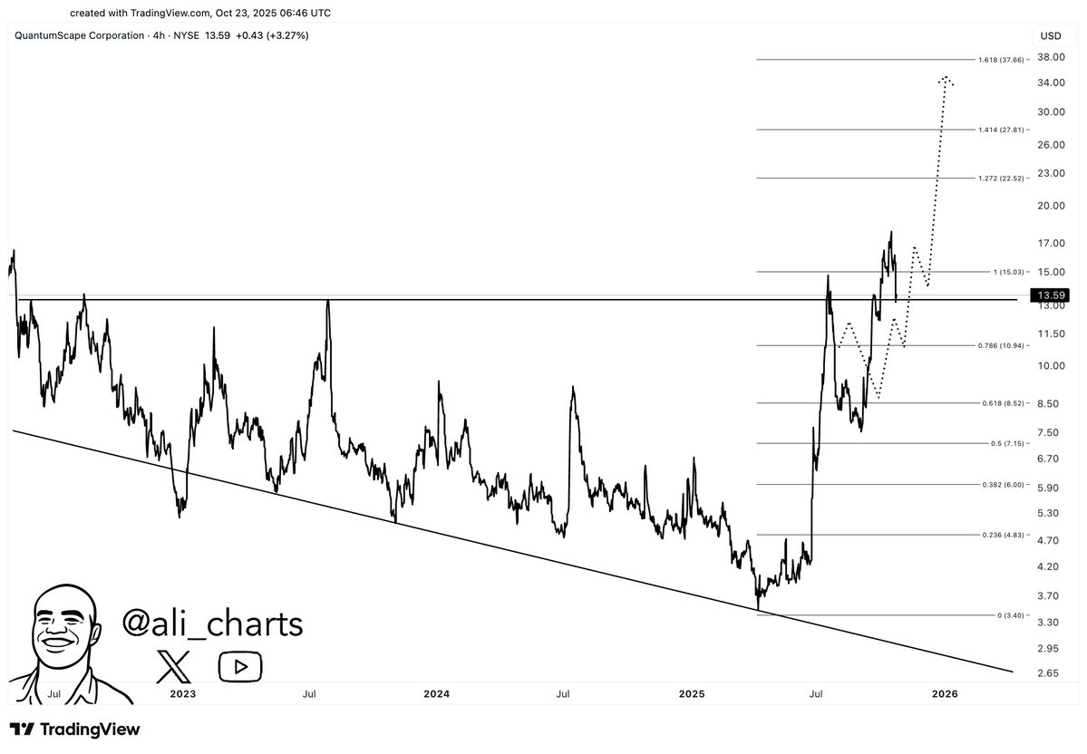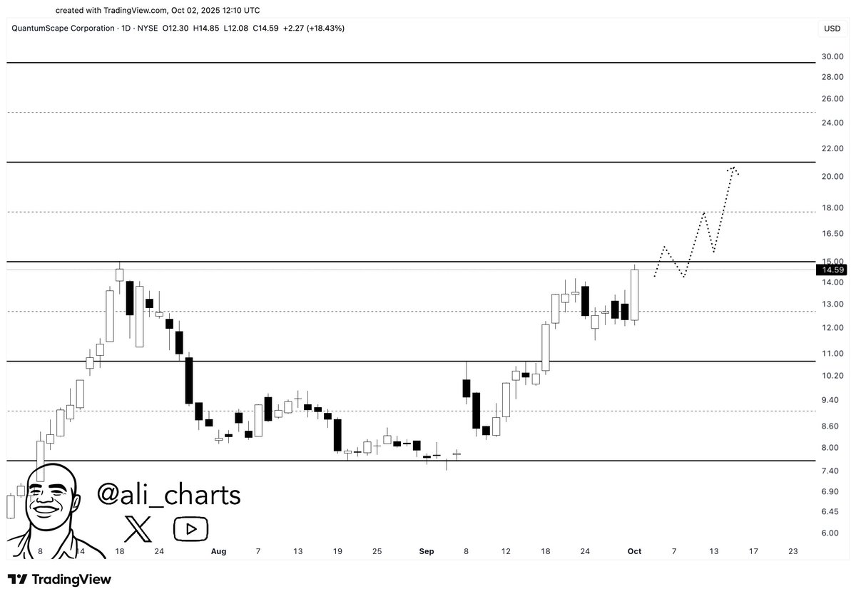 QuantumScape $QS 突破15美元大关。目标价位:21至29美元。