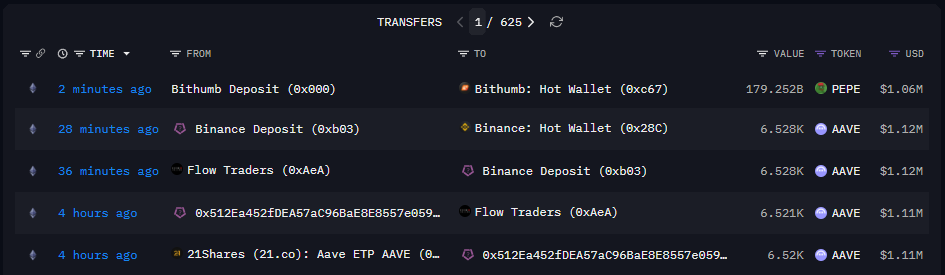 3周内,#21shares累计向交易所及#Flowtraders转移了35.7k $AAVE(约$5.74M)。