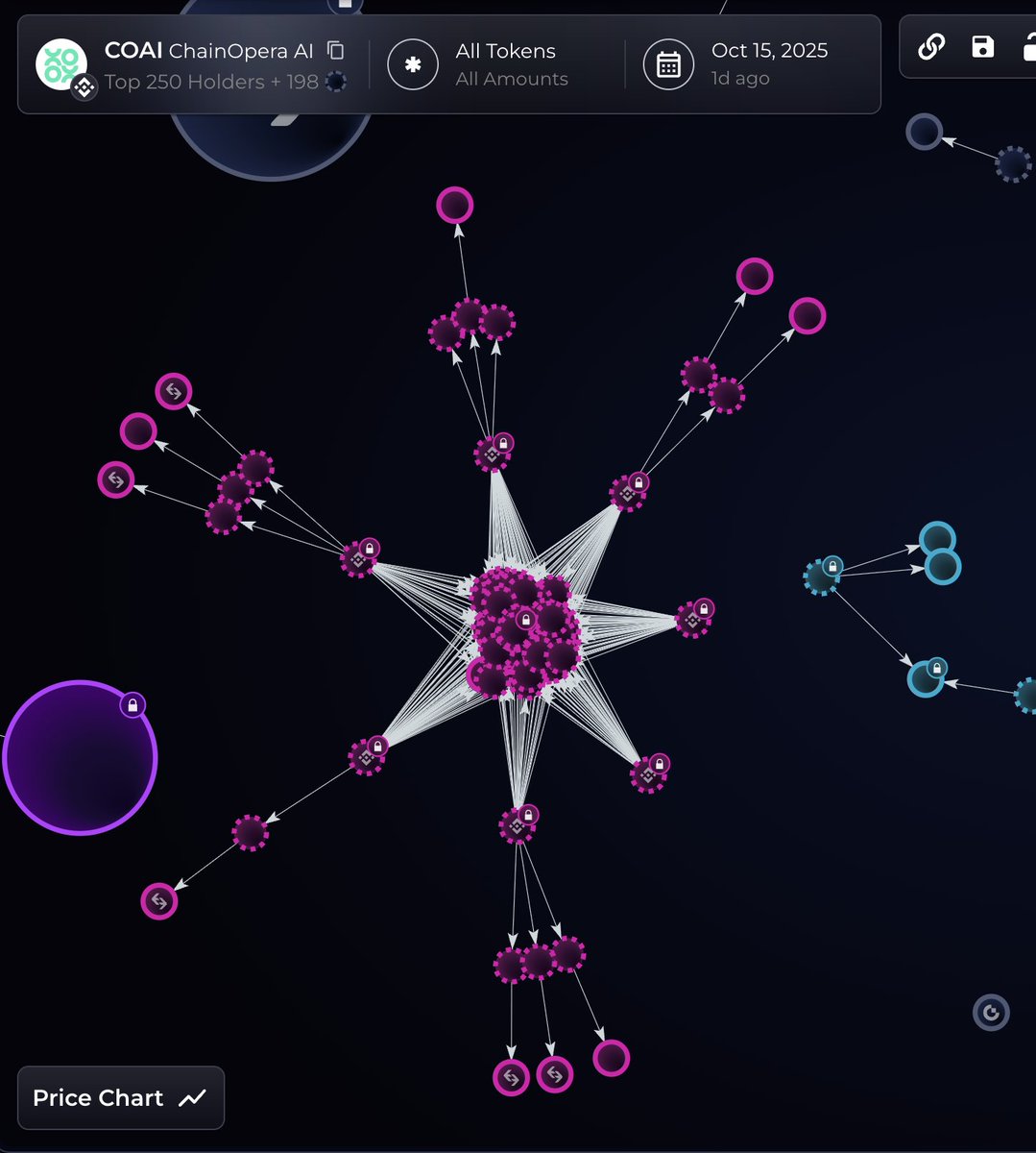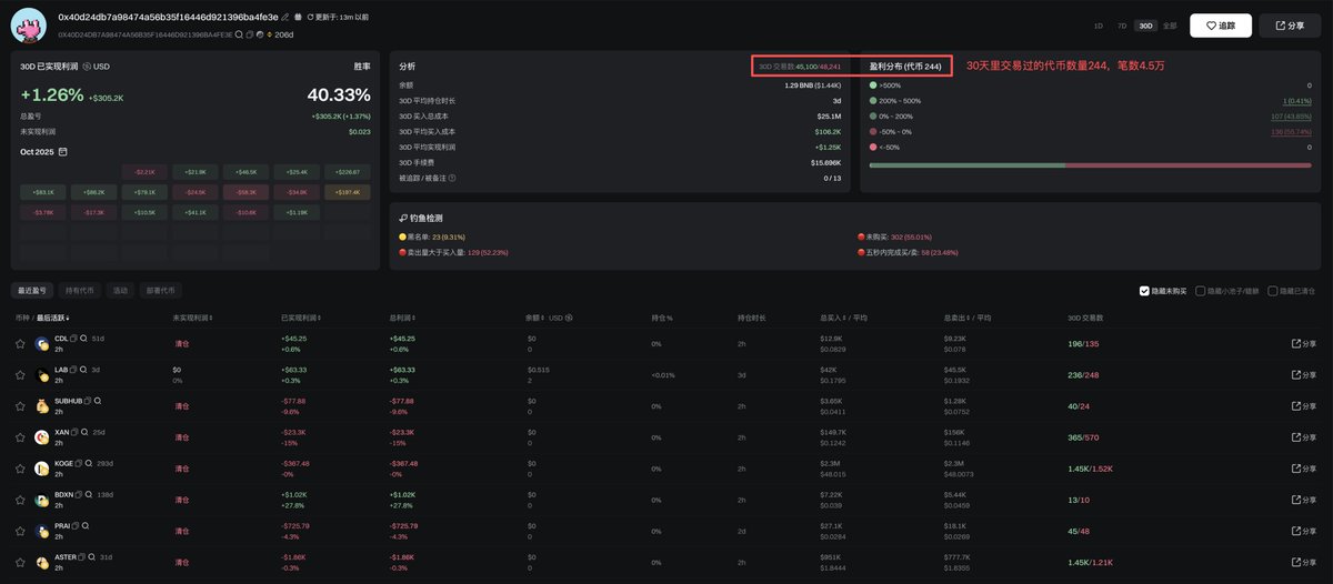 Bubblemaps 提到了一个在 $COAI 上大规模盈利的团体地址,有朋友猜测可能是 COAI 项目方让我瞅瞅。我看了下这批地址,我个人觉得这批地址大概率是一个做 Alpha 代币套利或量化的外部团体,而非单个项目的项目方。 ◎从币安提出 BNB 的操作高度相似且地址创建时间都在 3/25 来看,这确实是同一个实体的特征。不过这批地址从 7 月份开始就每天都在进行大量的 Alpha 代币交易,每天交易币种多达几十个,交易笔数几千笔,非常高频。 ◎这批地址每一个都在最近 30 天里交易过的代币数量超过 240 种,交易笔数 4.5 万+。这种规模和频率基本也只能是做套利或量化的团体的交易 BOT 了。