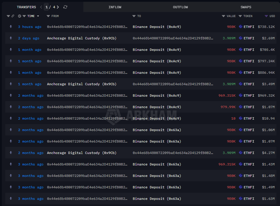 ◎132 万枚 $ETHFI ($100 万),均价 $0.76;