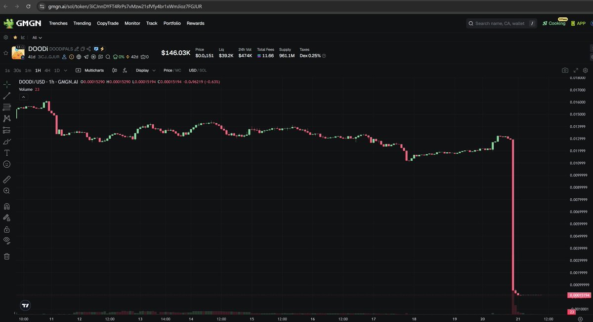 私钥泄露了,几十个钱包地址里的 $DOODi 被盗,被逐步换手成 SOL,黑客获利约 917 SOL。cc @MistTrack_io
