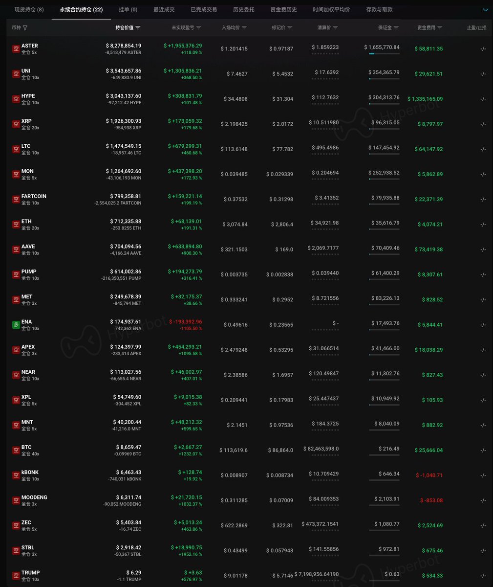 地址 0xa31...8aD1E 自今年六月以来始终坚持「做空山寨」策略,自 1011 闪崩后利润大幅提升,账户总体盈利已超 7886 万美元;目前他的 22 个仓位中只有 $ENA 为多单且浮亏,其余 21 个空单仓位均盈利,TOP1 为 $ASTER(浮盈 195.5 万美元)