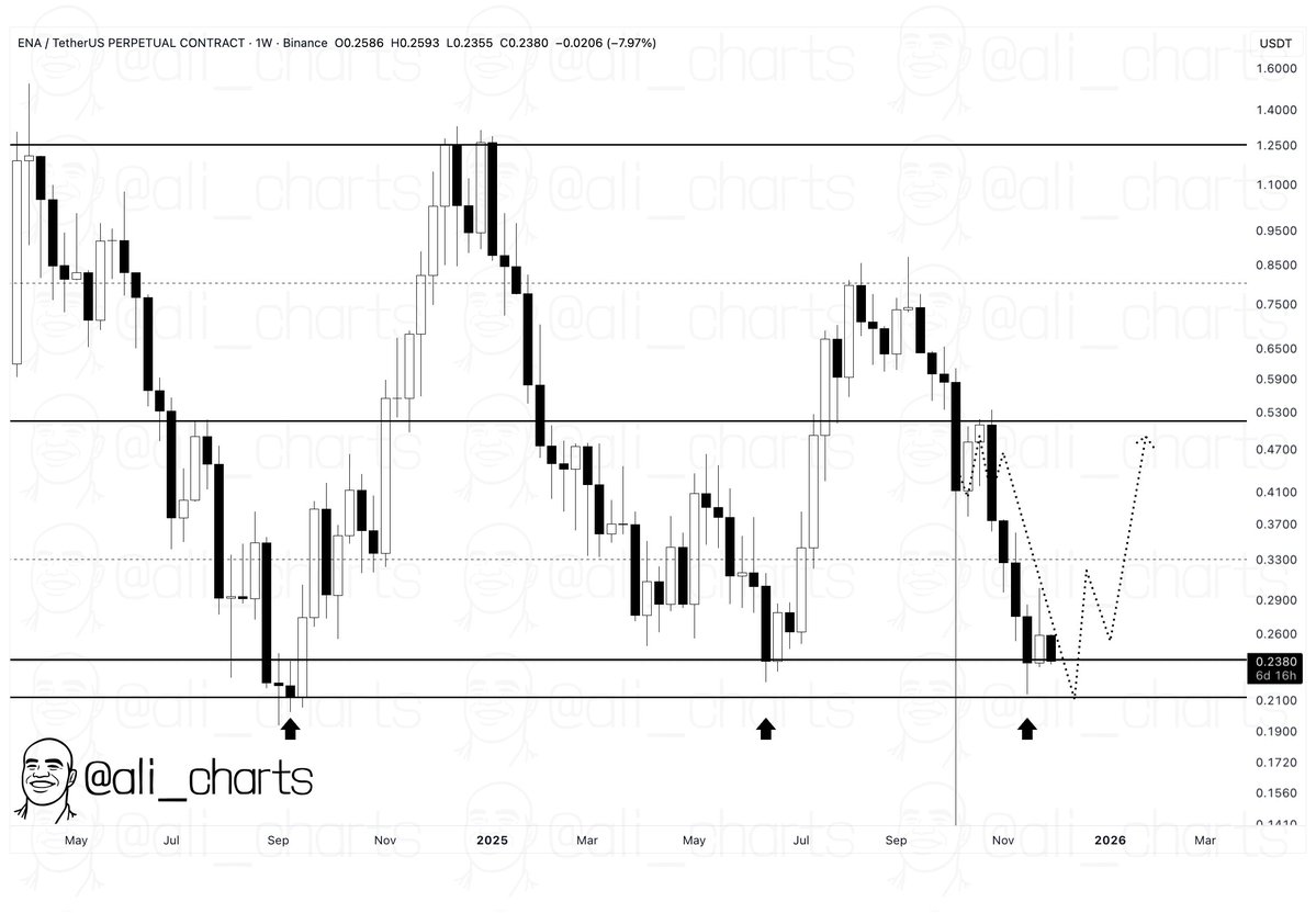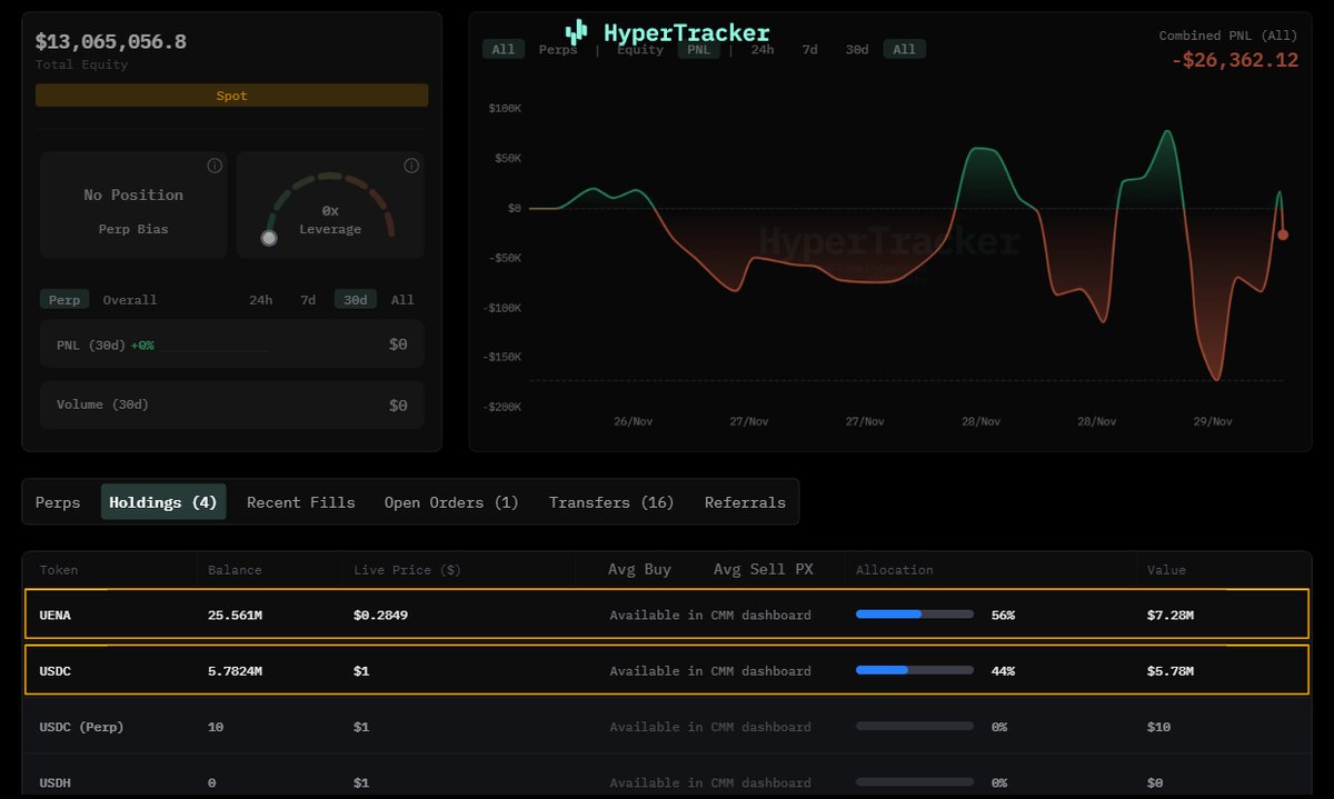 8 小时前 651 万枚 USDC 充值进 Hyperliquid,中转后转至该建仓地址;他从昨晚 22:30 开始分批建仓,目前已买入 2526 万枚 ENA,平均成本约 $0.2845,仍剩余小额限价挂单未成交