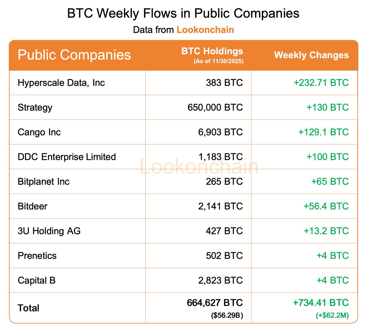 🟢 上周共有9家上市公司增持了734.41 BTC(6220万美元)。