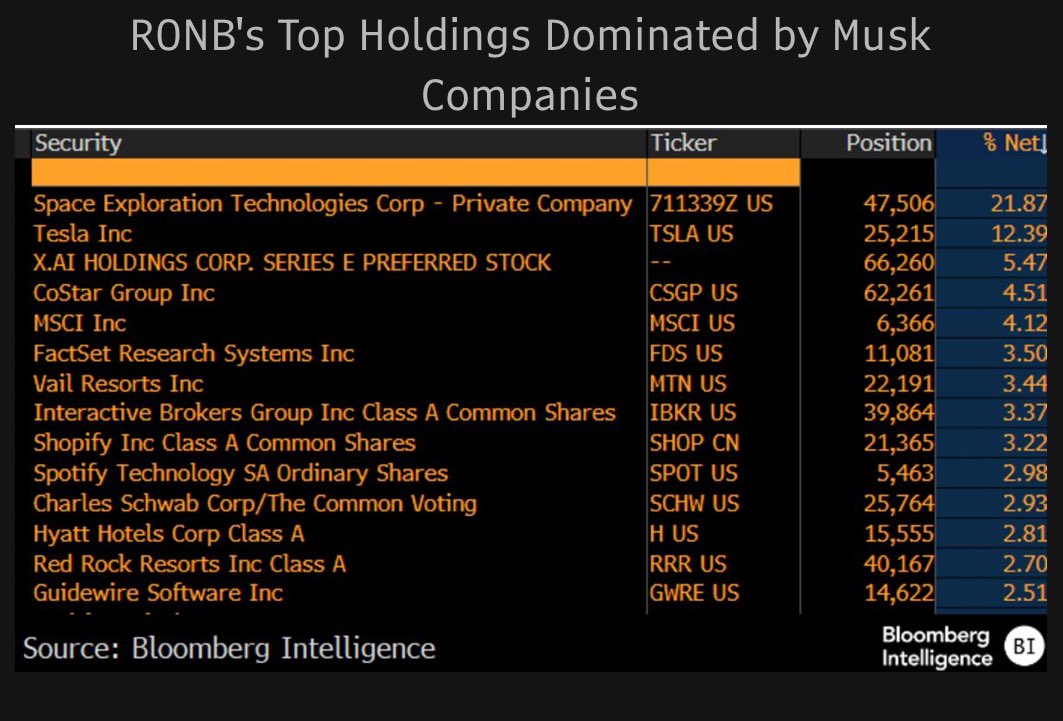 $RONB 自上周五加入大量 SpaceX 后迅速吸收了 $32m.. 这意味着资产在两天内有机增长了33%。也就是说,SpaceX 权重如预期般稀释,从22%降至19%。