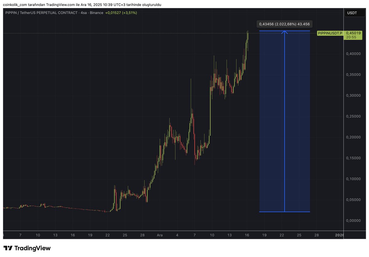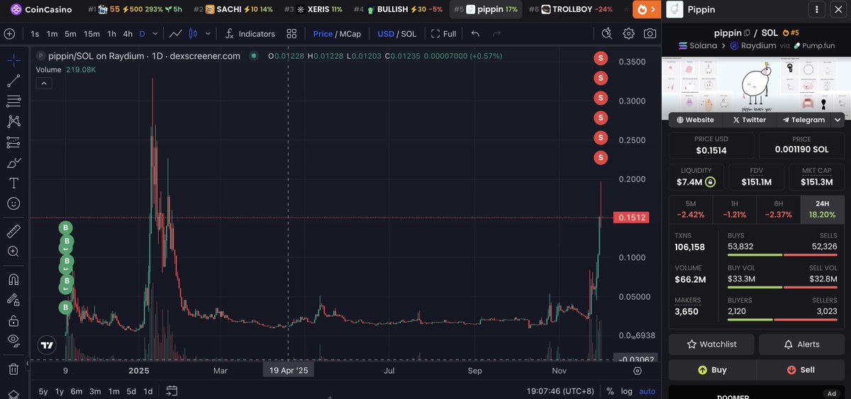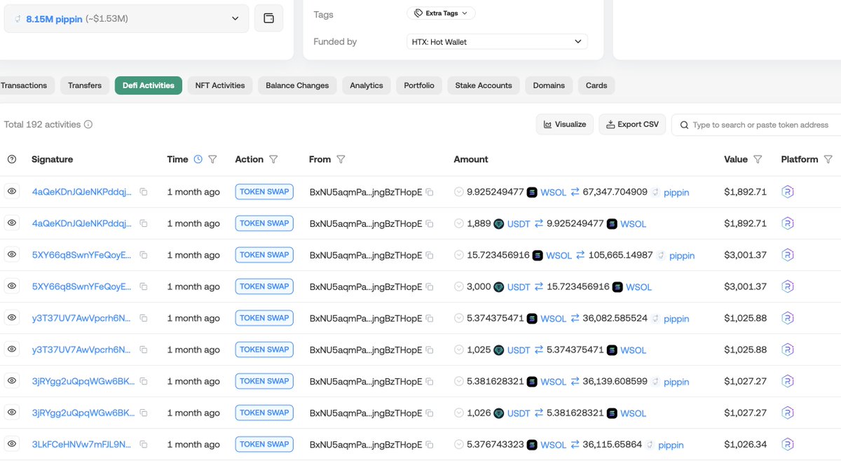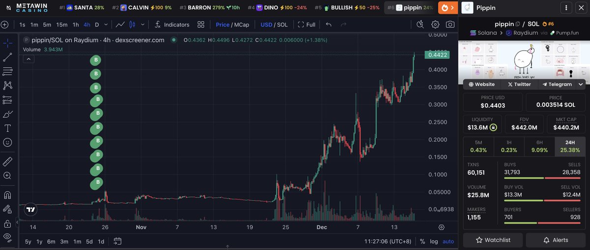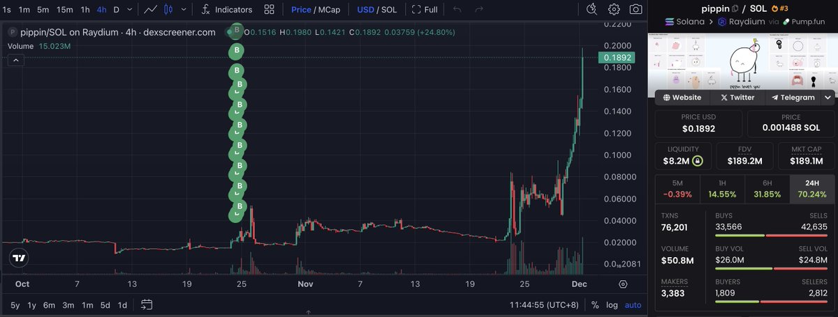即使市场低迷,一夜暴富的故事仍在不断涌现。交易员BxNU5a在不到两个月的时间里将18万美元变成了360万美元,回报率高达20倍。他在10月24日花费18万美元购买了8.16M $pippin,目前仍持有——现在价值360万美元。
