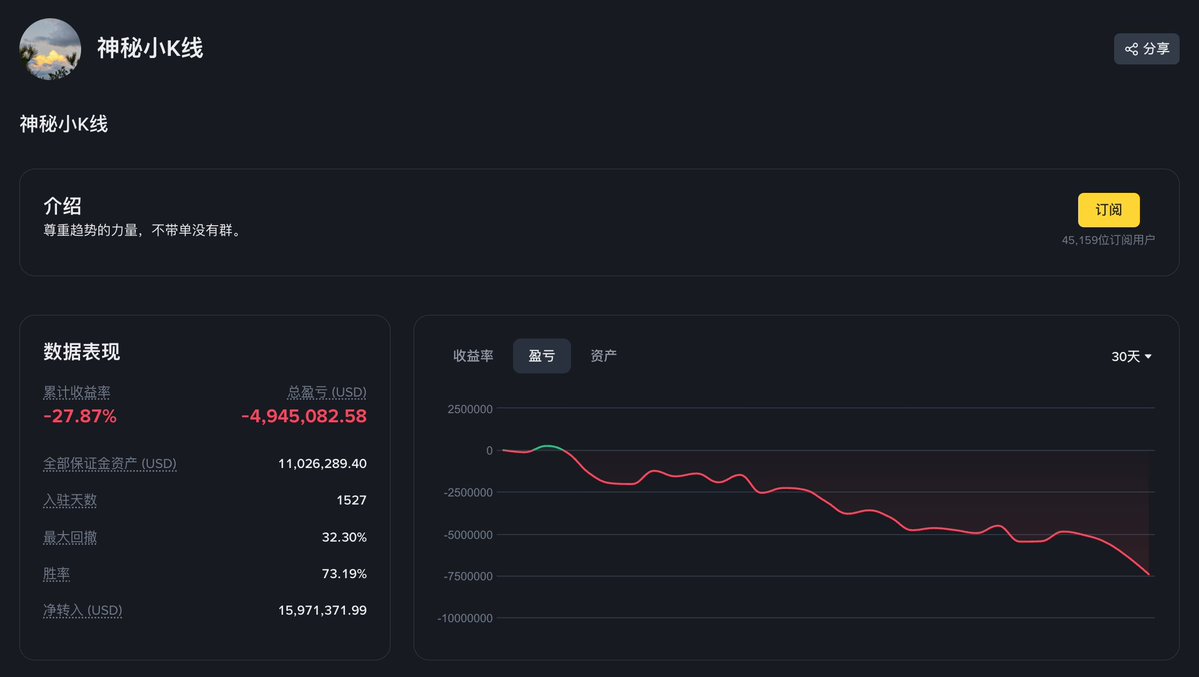 目前「神秘小 K 线」的币安合约实盘面板显示已累计亏损 494.5 万美元,近一个月的收益曲线一路向下: