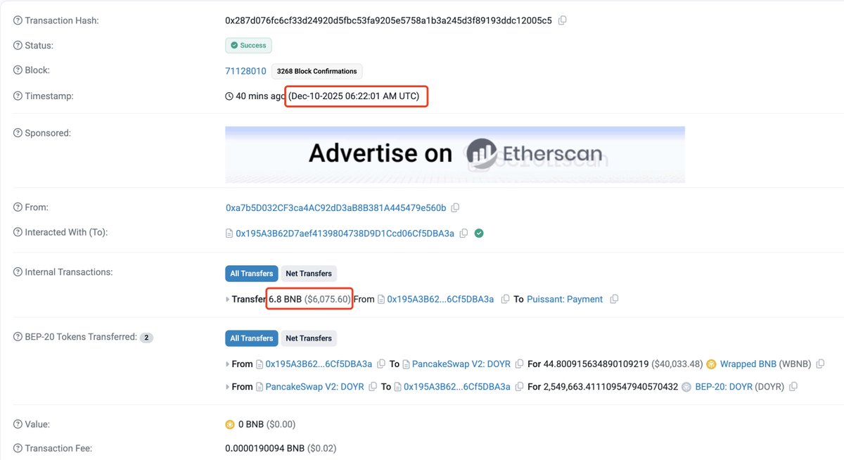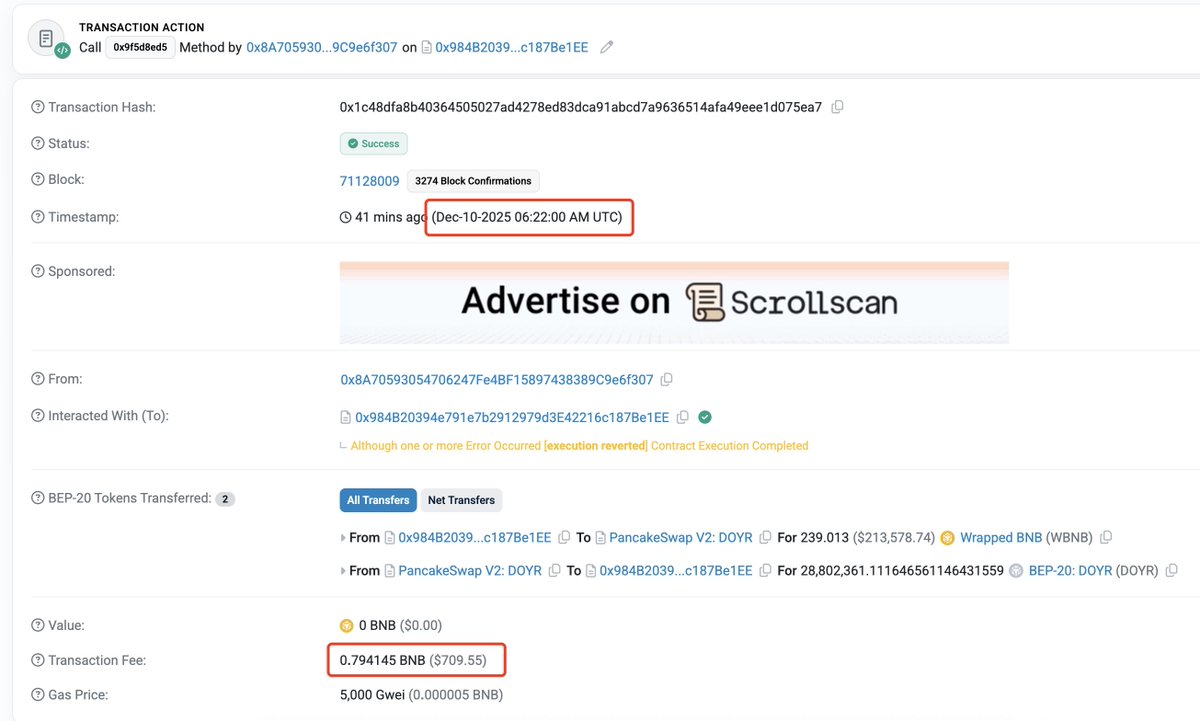 交易员0xa7b5额外支付了6.8 $BNB($6,074)的小费,花费了44.8 $BNB($40,079)购买了2.55M $DOYR,然后以32.12 $BNB($28,734)的价格卖出——总共亏损了17.4K美元。