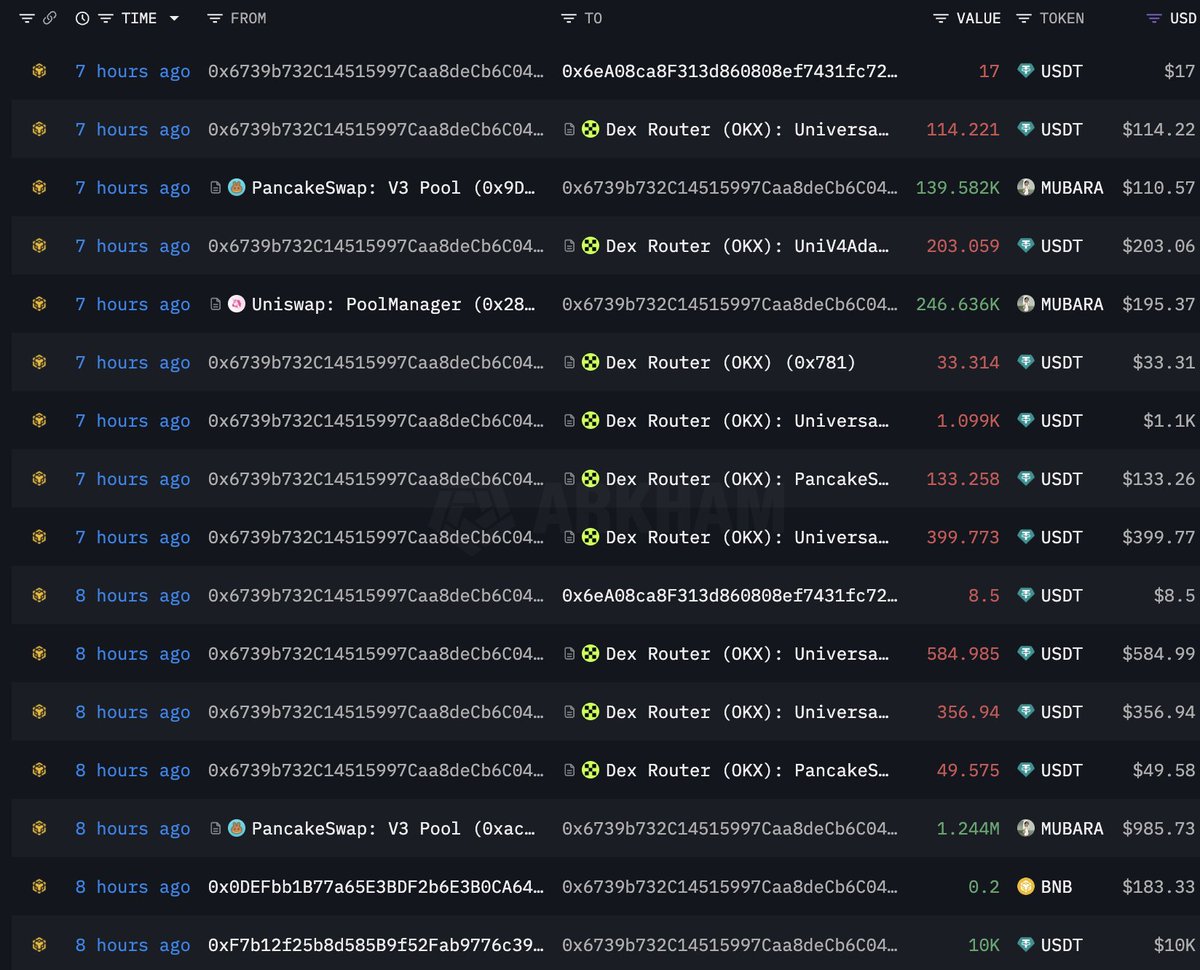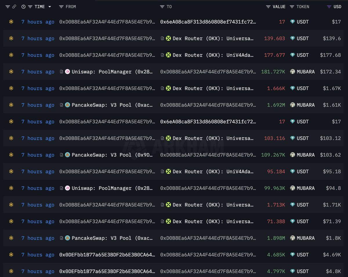 黑客大约7小时前创建了2个新钱包(0x6739和0xD0B8),花费了19,479 $USDT购买了21.16M $Mubarakah。