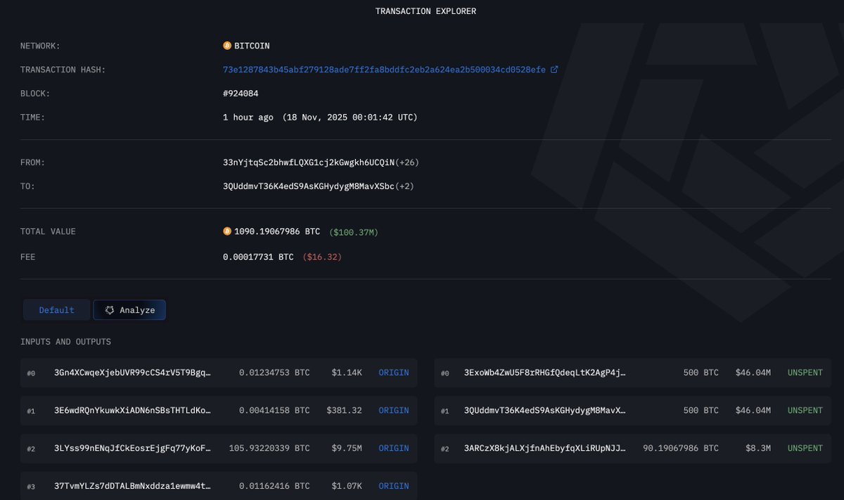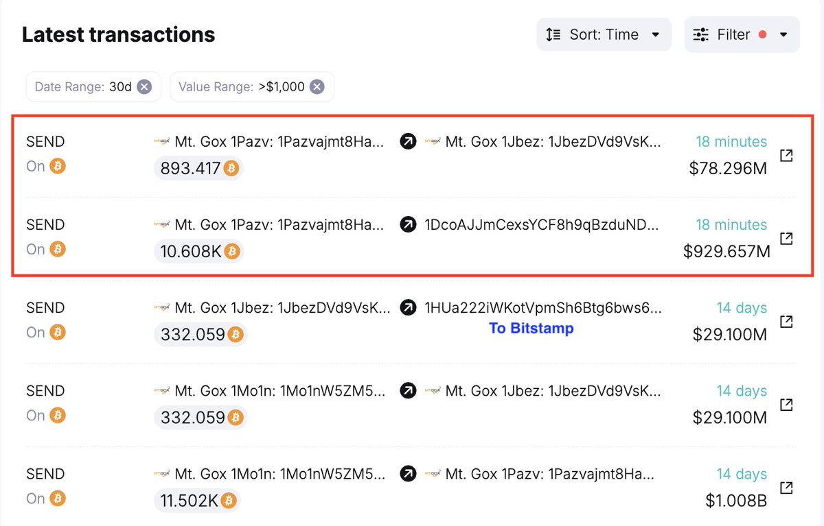 • 转移了10,422 $BTC(9.37亿美元)到一个新钱包——可能是其自己的冷钱包——可能稍后会以小批量分发到交易所(约4小时前)