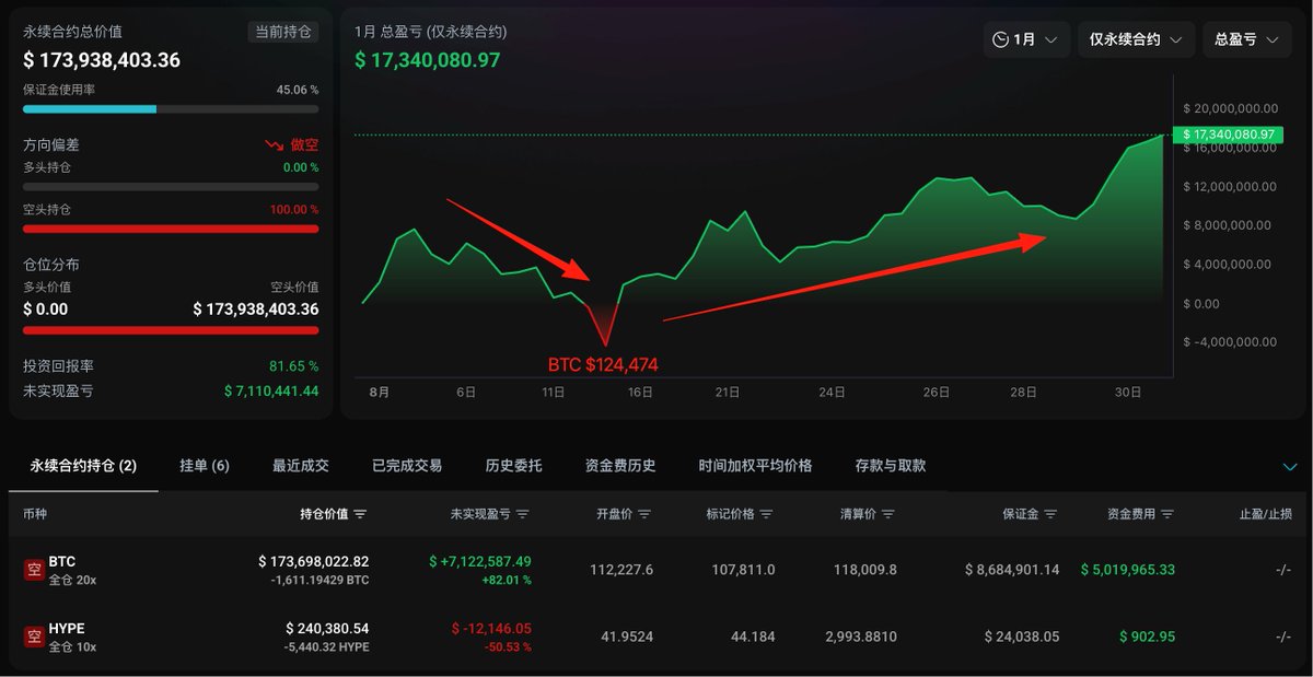 「2025.03 以来连续四次做空 $BTC 的巨鲸」又从浮亏 1281 万美元生抗到浮盈 708 万美元了,空单开了这么久资金费还赚了 502 万美元