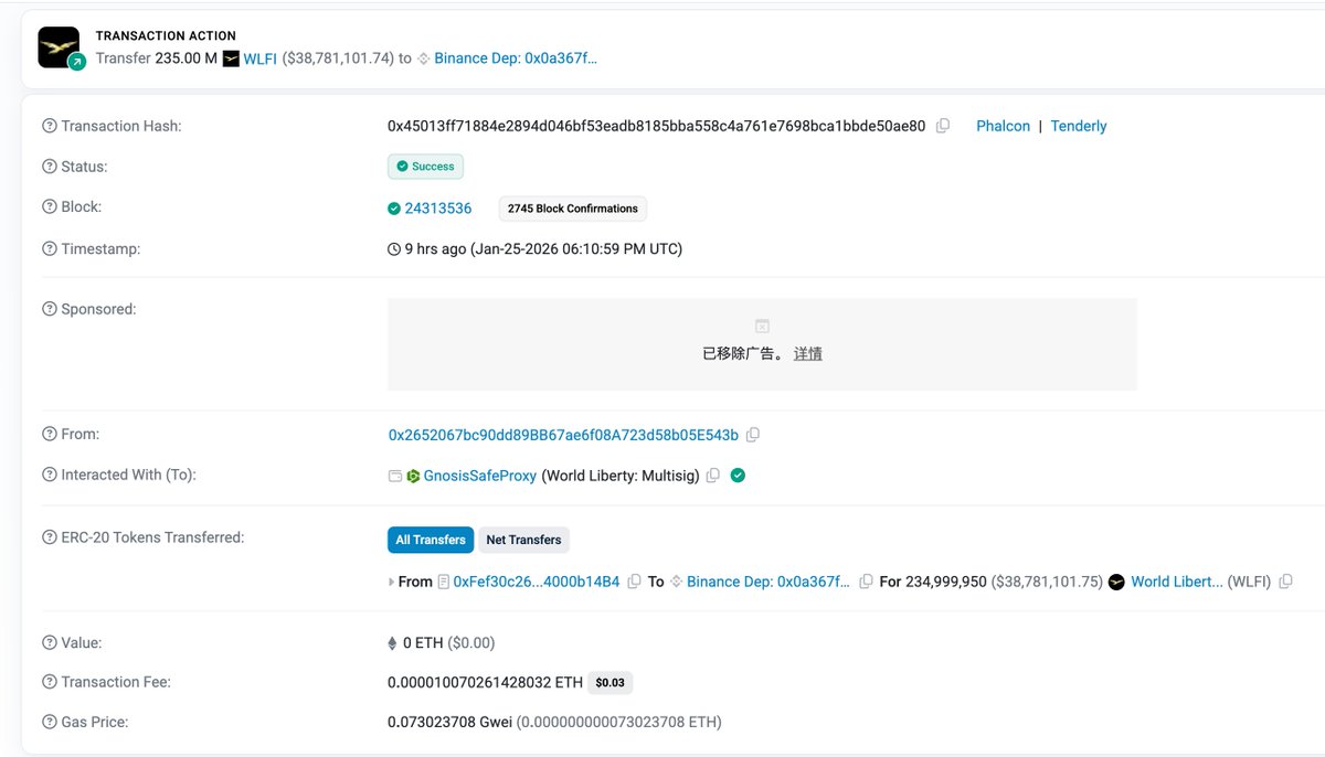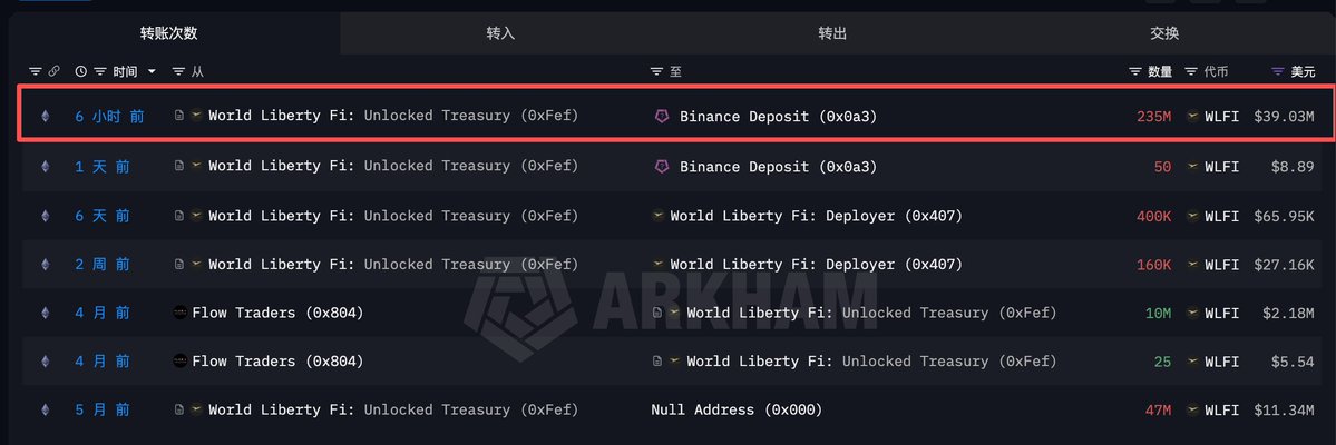 9 小时前 $WLFI Unlocked Treasury 合约向 #Binance 充值 2.35 亿枚 WLFI,价值 4000 万美元