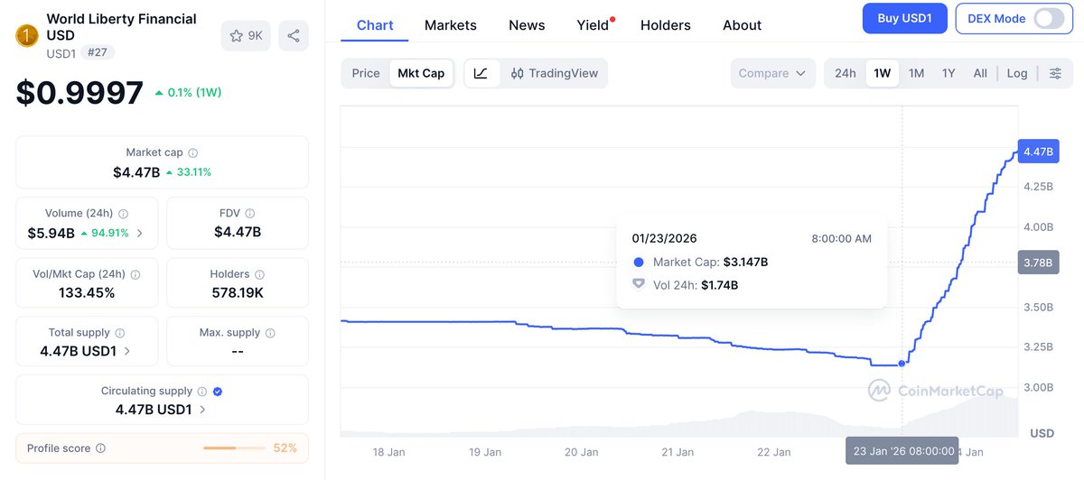 自 01.23 币安发布活动公告至今,USD1 发行量已暴增 17.6 亿枚,达到 49 亿!距离 TOP5 稳定币市值仅剩 4.58 亿美元(数据来源于 CMC)