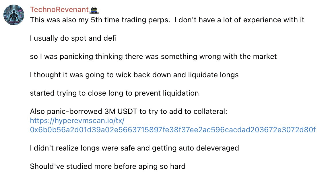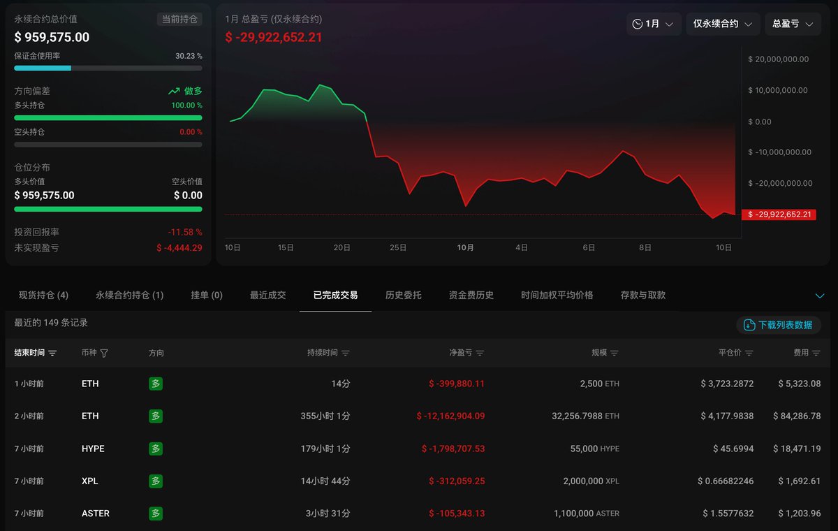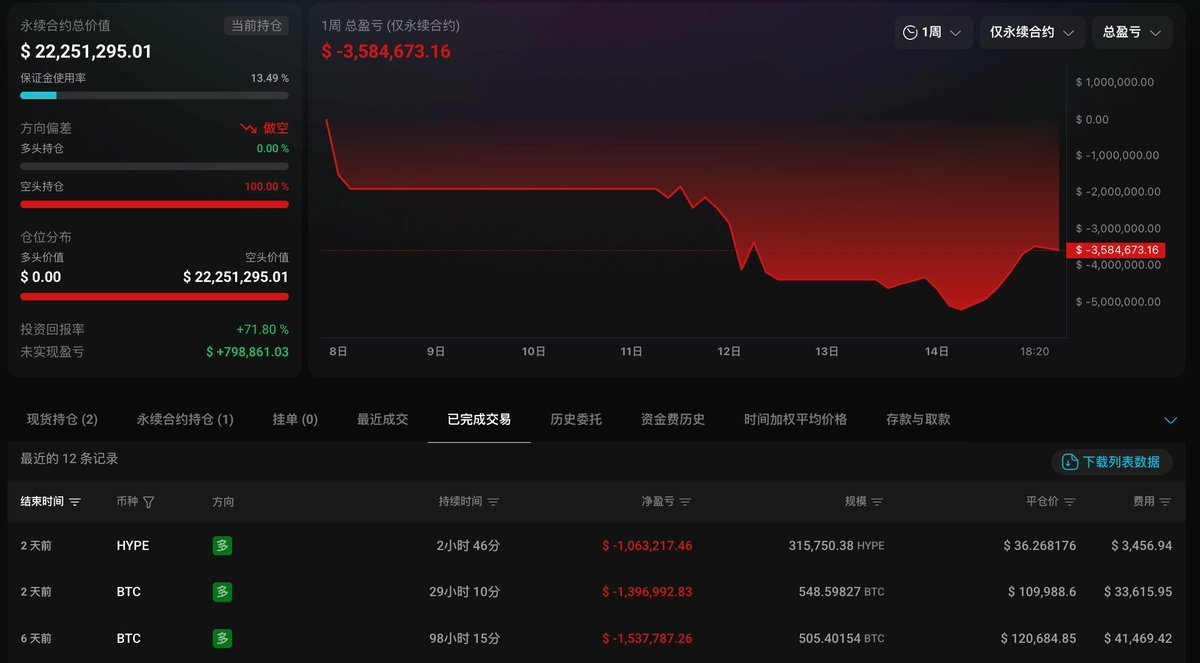曾用 20 分钟赚到 3800 万美元的 $XPL 操纵者 @Techno_Revenant 最近也在亏钱:疑似他的小号 0x9b8...425b0 在 1011 闪崩事件的第二天开多 $BTC 和 $HYPE 亏损 246 万美金,近一周亏损则达到 365 万美金