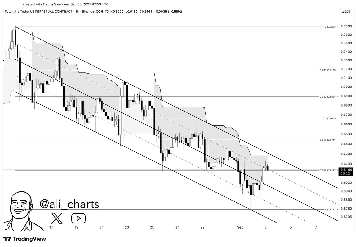 $FET仍处于下跌趋势中。在$0.63的拒绝可能使其回落至$0.57的支撑位。