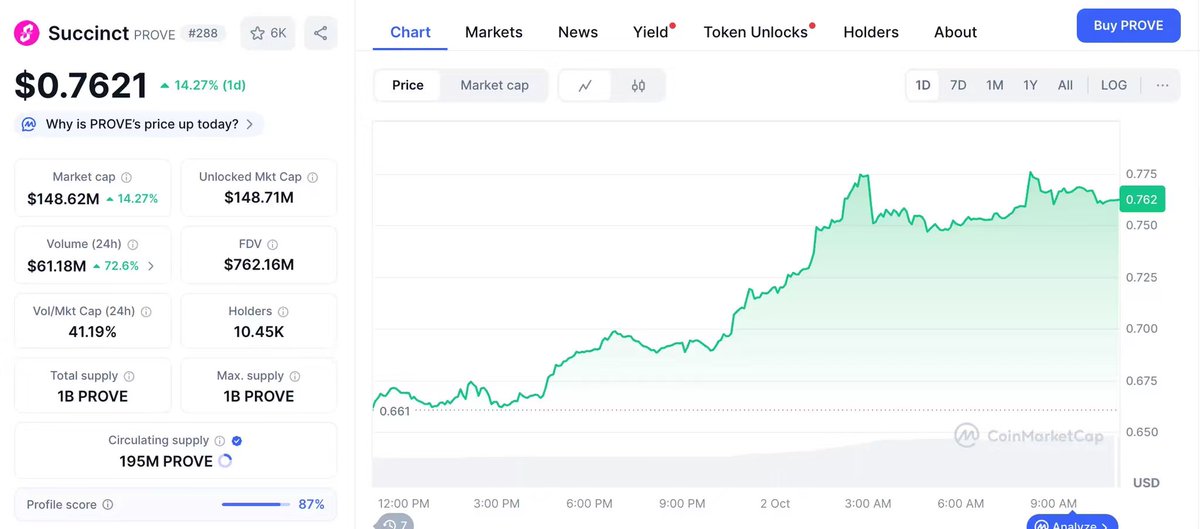 目前 PROVE 流通市值还有 1.75 亿美元,FDV 8.98 亿美元,在一众 zk 项目中市值排名第七