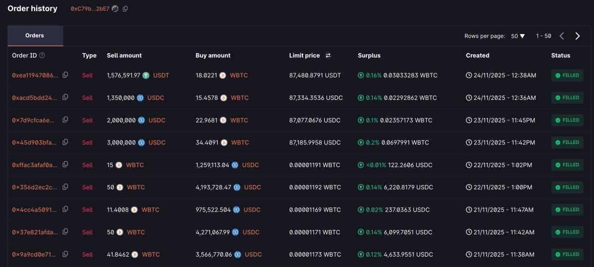 $116504 高点建仓 $WBTC 的大户 0x4ED...bC853 时隔一周再次割肉🥹 11 小时前他再次以均价 $91333.4 抛售 100 枚 WBTC(约 913 万美元),亏损 251.7 万美元 此前他已在 11.17-11.21 期间分批清仓了 17497 ETH 并亏损 1840 万美元,近期陆续割肉 WBTC,目前仍剩余 1210 枚,价值 1.1 亿美元,浮亏 3091 万美元