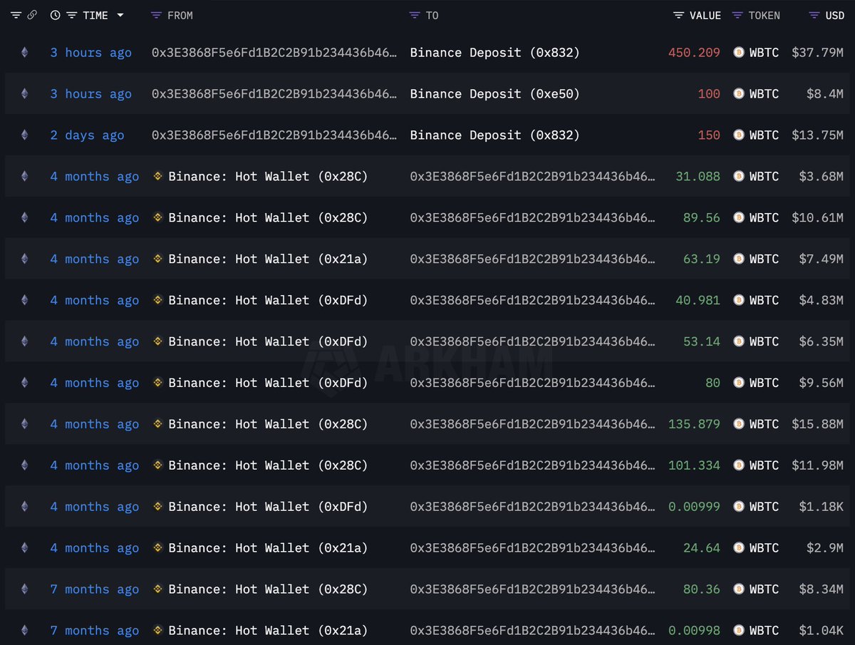 3 小时前其中地址 0x9b8...822d8 向 #Binance 充值最后 150 枚 WBTC,价值1287 万美元;至此,他在 2024.02-2025.02 期间建仓的 2,189.23 WBTC 已全部充值进交易所,均价 $95994