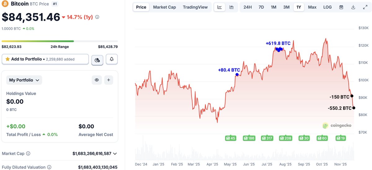 $116504 买的 $WBTC $4376 买的 $ETH 难顶,现在是割还是抗呢? 地址 0x4ED...bC853 的选择是「清仓 ETH,卖掉部分 WBTC」—— 过去 8 小时他以均价 $84710 卖掉了 250 WBTC(2117 万美元),亏损 794.8 万美元 而 ETH 则是在 11.17-11.21 期间分批清仓的,最终以 $2994.9 卖掉了 17497 ETH(5241 万美元),此前建仓的 13316 ETH 亏损 1840 万美元 也就是说:他在今年八九月时高点囤积的 WBTC 和 ETH,仅不到四个月就实质性亏损了 2,634.8 万美元,剩余 1310 WBTC 仍浮亏 4071 万美元…