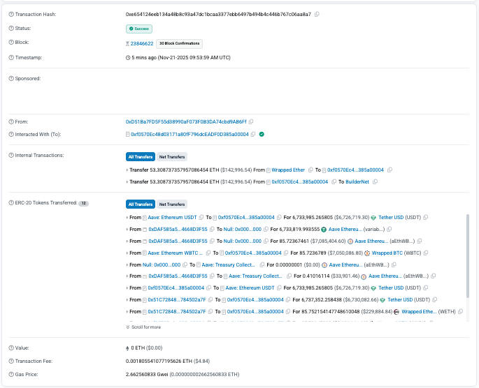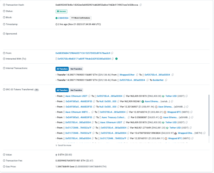这个巨鲸/机构目前已通过循环贷方式在三周时间里囤积了价值 $2.3 亿的 $WBTC 和 $ETH 。 ◎1,356.8 WBTC,价值 $1.49 亿,均价 $117,556; ◎18,454 ETH,价值 $8106 万,均价 $4,415。 因为有通过循环借贷加杠杆,他在 Aave 上的借款也高达 $1.14 亿。