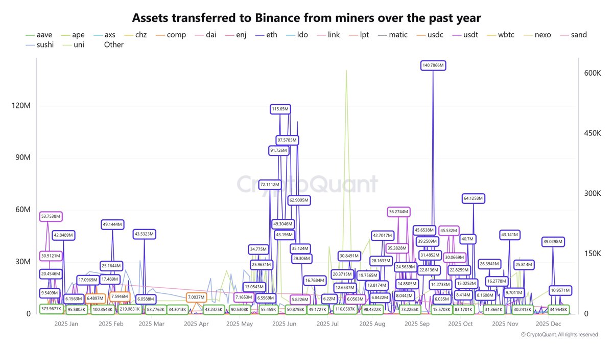 四年前均价 $10708 建仓 1074 $WBTC 的地址」卖完 $WBTC 似乎开始卖 $ETH 了?他曾在今年七月以均价 $118011 止盈 1000 BTC 并获利 1.07 亿美元🤔 10 小时前向 #Binance 充值 5000 ETH,价值 1536 万美元,过去 2 周他已累计向交易所充值 13403.28 枚,总价值达 4106 万美元 该地址目前仍持有 1.5 万枚 ETH,且与 Galaxy Digital 关联地址存在交互,暂时无法确认钱包归属