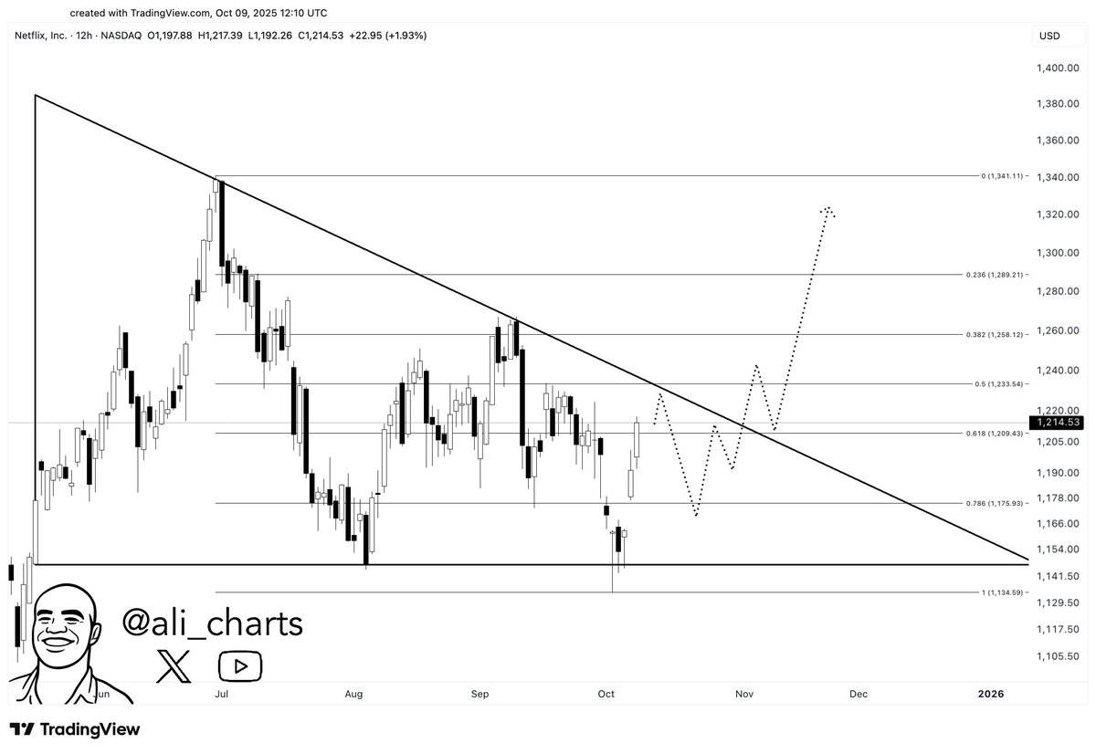 Netflix $NFLX 正在三角形中盘整。看涨突破可能会使其回到 $1,340。