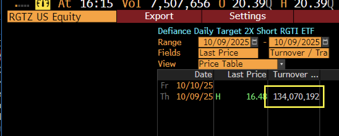 The -2x Rigetti Computing ETF今天首日交易额达到$134m..这无疑是2025年推出的ETF中最大的数字。$MEME前两天也分别达到$17m和$34m,规模相当大。正如我们本周早些时候所写,交易员对新推出的ETF反应热烈。以前要达到如此大的数字需要很长时间。