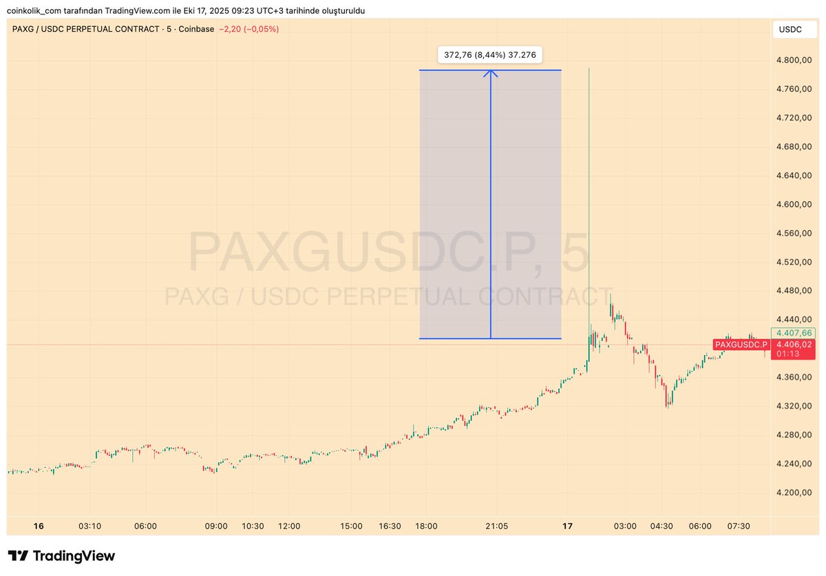 与黄金挂钩的加密货币 $PAXG 昨晚在分钟蜡烛图上上涨超过9%,并在同一分钟内回落至先前水平。