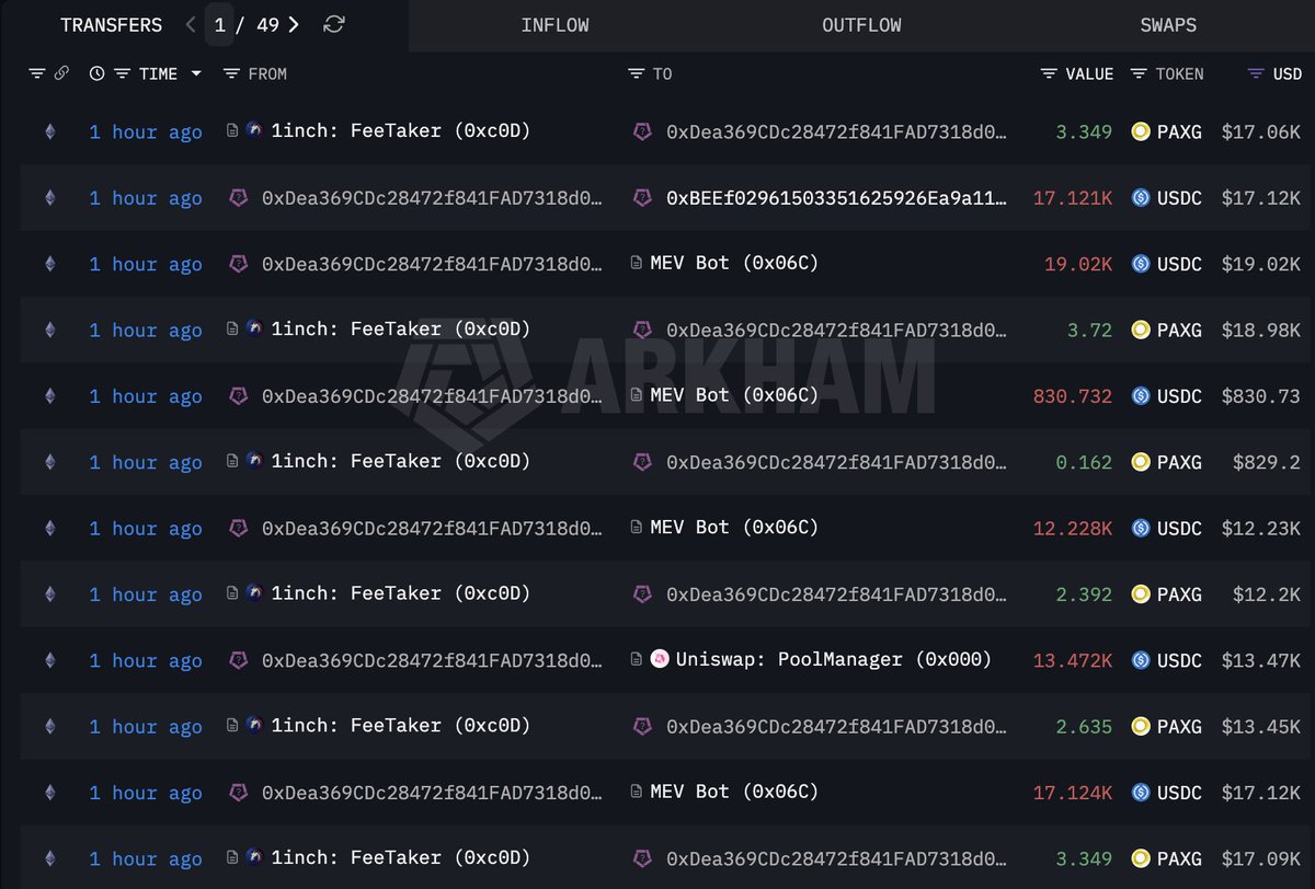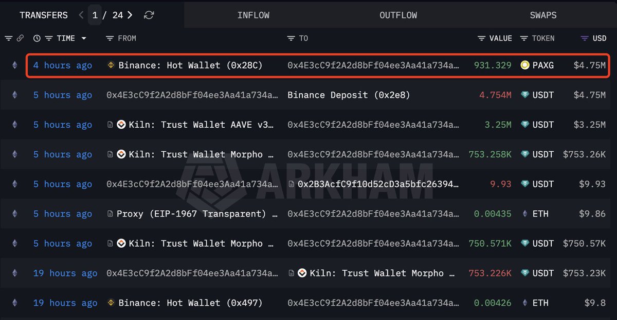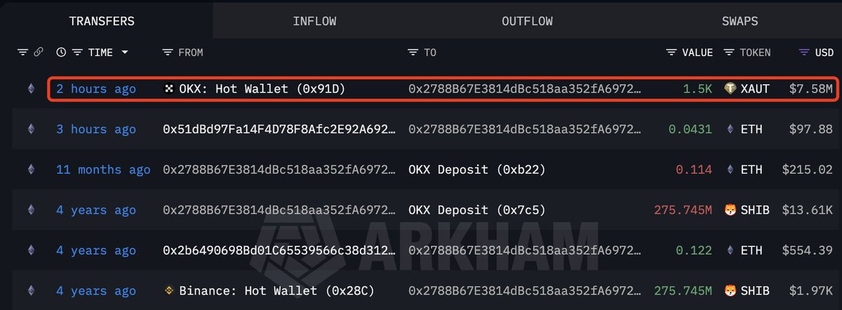 - 鲸鱼"0x7dc"在过去24小时以$5,321的价格购买了667 $XAUT,价值$3.55M。