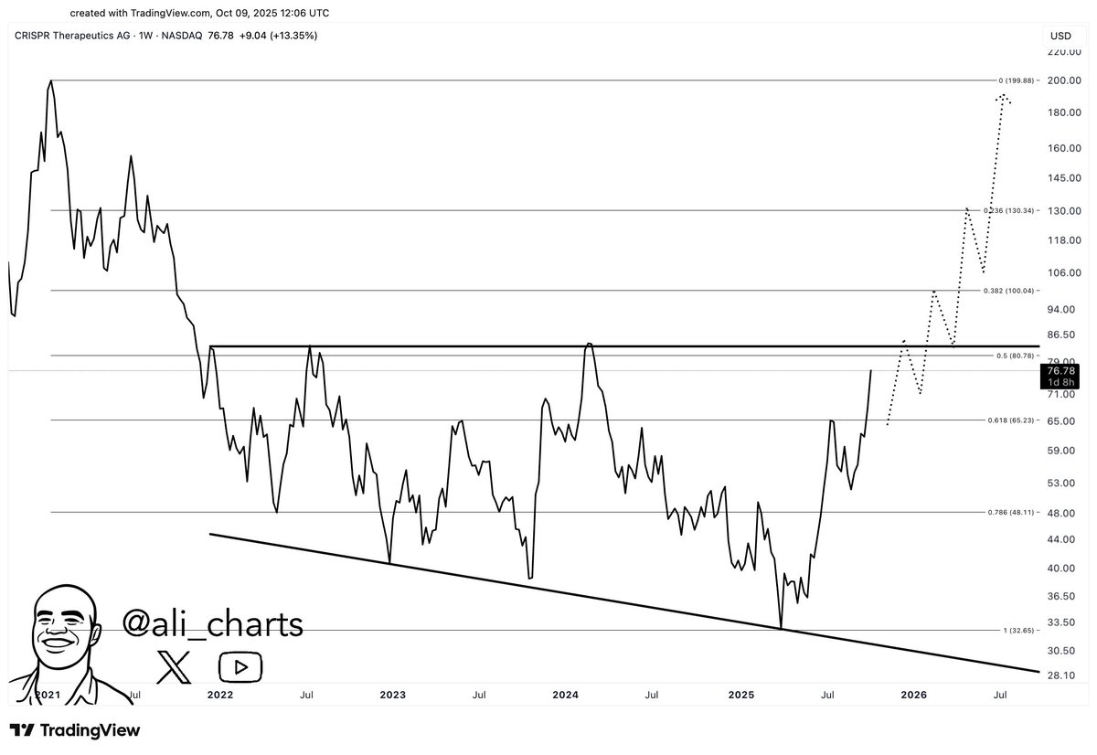 CRISPR $CRSP 看起来准备突破了!突破85美元可能为上涨至200美元打开道路。