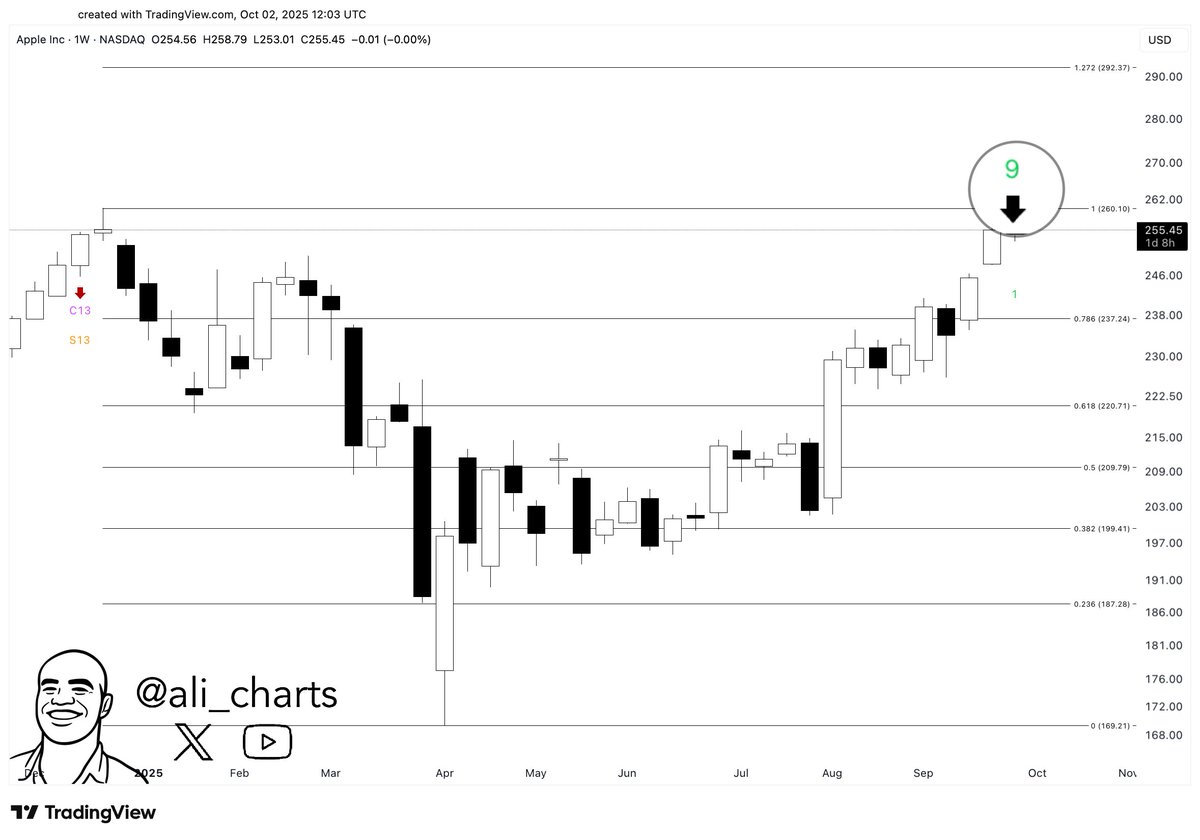 苹果 $AAPL 可能跌至 230 美元甚至 220 美元,因为 TD Sequential 发出了周线卖出信号。