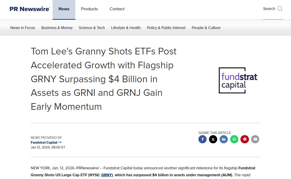 Tom Lee的Granny Shots ETFs帖子加速增长,旗舰产品Fundstrat Granny Shots US Large Cap ETF $GRNY资产超过40亿美元,同时Fundstrat Granny Shots US Large Cap & Income ETF $GRNI和Fundstrat Granny Shots US Small- & Mid-Cap ETF $GRNJ获得早期势头