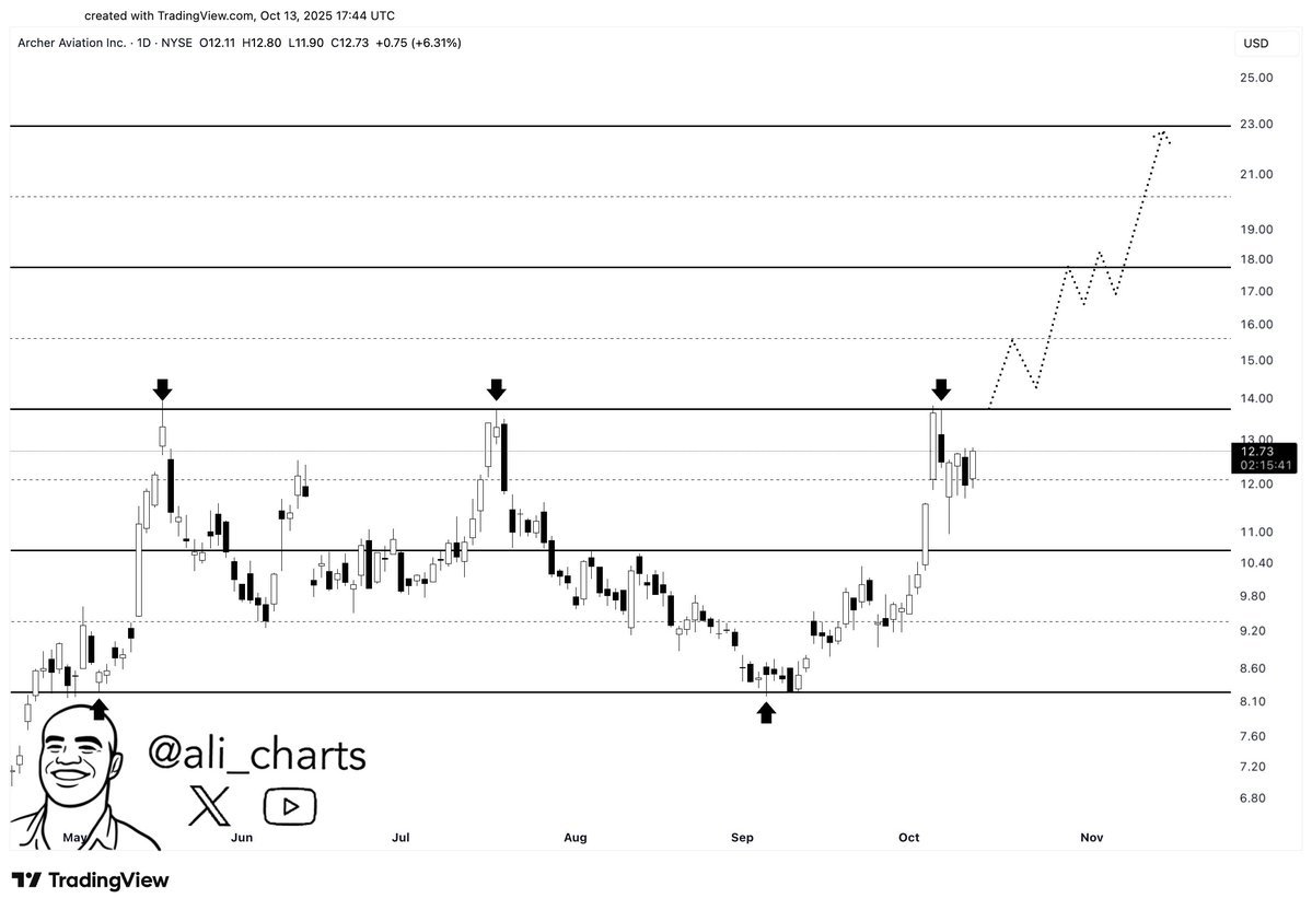 如果Archer $ACHR突破$14的阻力位,预计将反弹至$23。