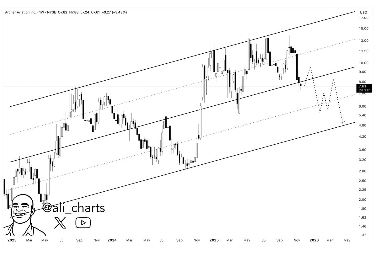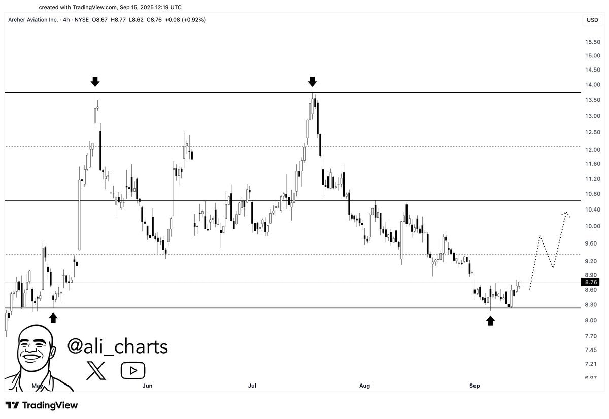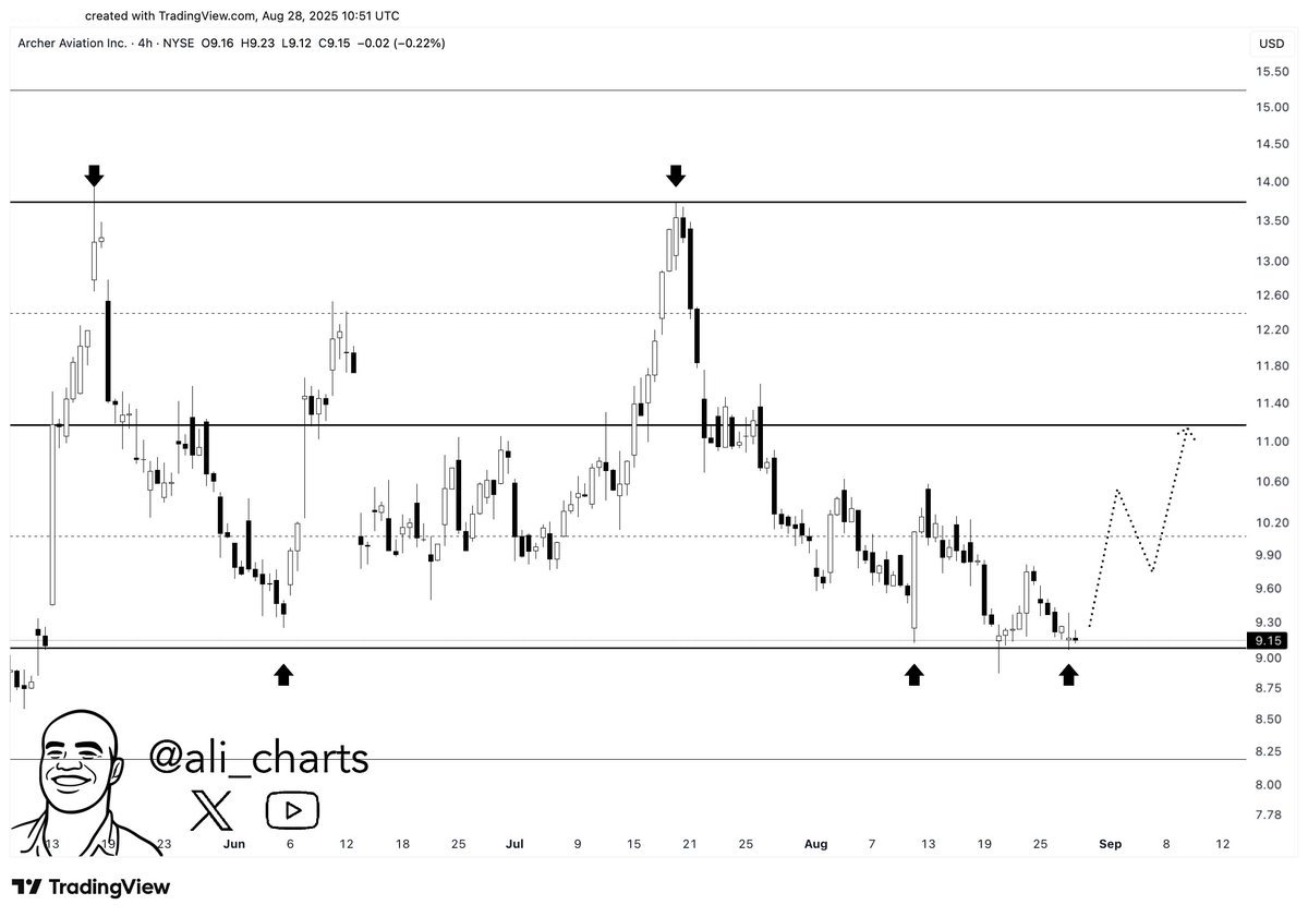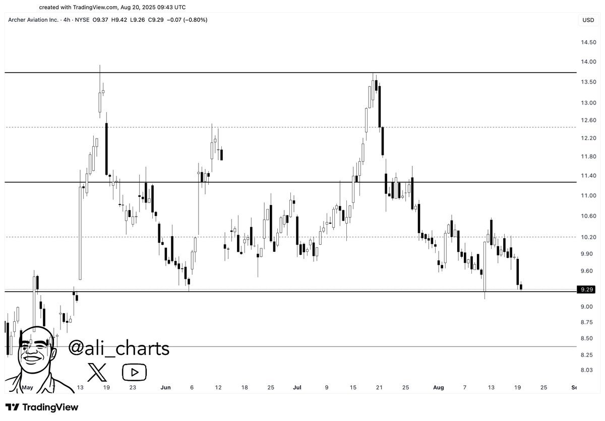 Archer Aviation $ACHR 处于关键支撑位!守住这里可能引发反弹至 $11.20。
