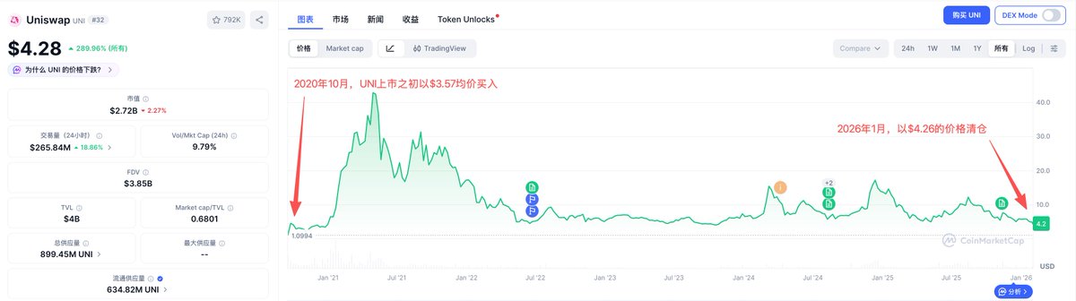 UNI 上市时买入、持有 5 年之久的钻石手今早清仓 249.3 万枚 $UNI ($1062 万),5 年持仓仅获利 $172 万 (+19%)。 前段时间以 $3,313 的均价清仓持有 5 年时间的 10.1 万枚 ETH ($3.34 亿) 而获利 $2.69 亿的巨鲸/机构。今天在 3 小时前清仓了同样持有长达 5 年时间的 UNI:把持有的 249.3 万枚 $UNI ($1062 万) 全部转进了 Binance。 他是在 UNI 刚上市时 (2020 年 10 月) 买进的这些 UNI,买进均价 $3.57。在持有了 5 年多时间后的今天,以 $4.26 的价格全部转进了 Binance,仅获利 $172 万 (+19%)。 他的 ETH 跟 UNI 都是在 2020 年买进的,同样是持有了 5 年时间,ETH 获利 400%,而 UNI 仅获利 19%。