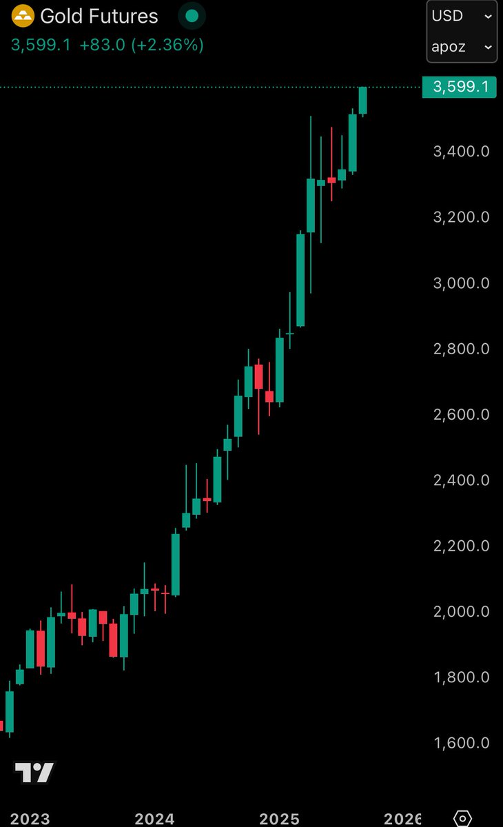 有史以来第一次,$gold 价格达到每盎司 $3,600。黄金年初至今上涨了+33%,是标普500指数回报的3.5倍以上。系好安全带。