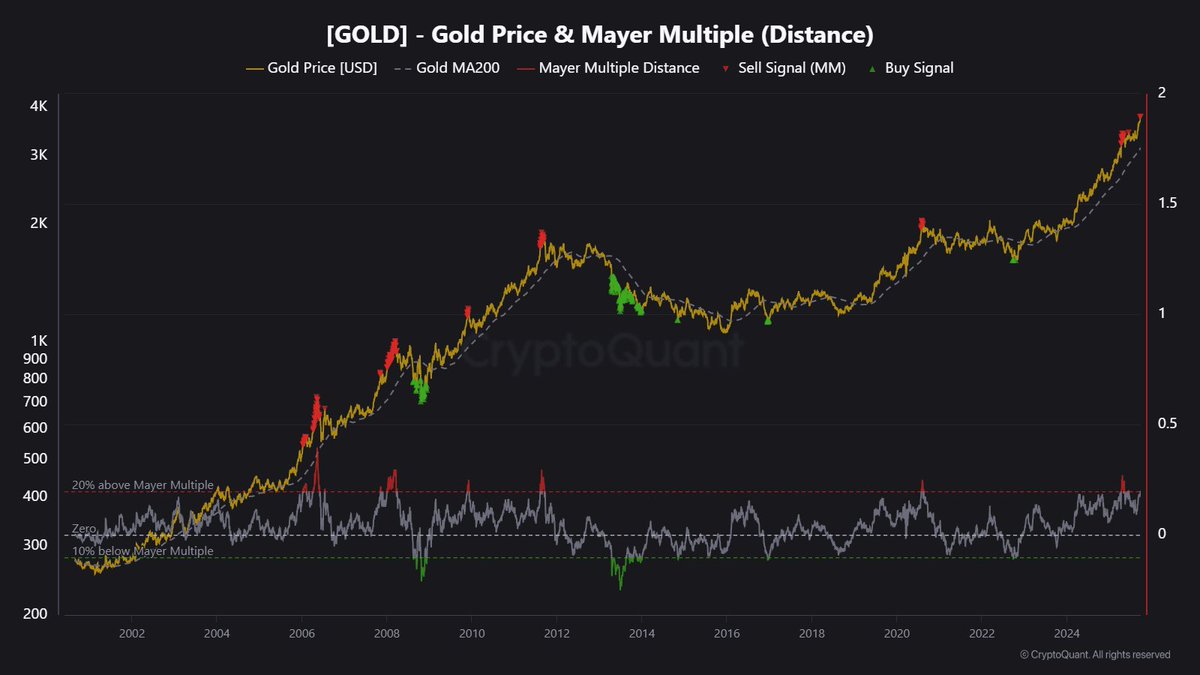 Mayer Multiple Distance显示$GOLD交易价格高于其200日均线20%以上。这一历史信号表明局部顶部或横盘。