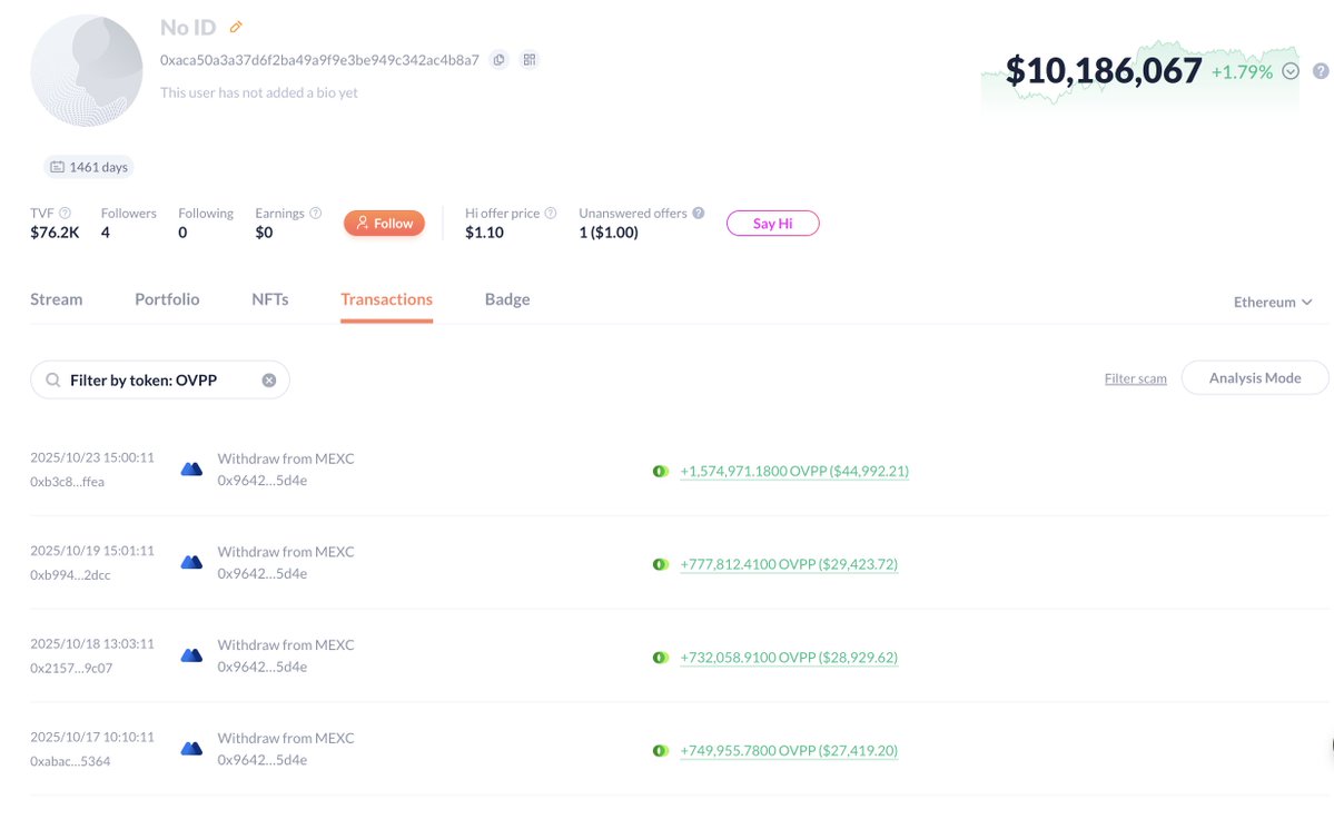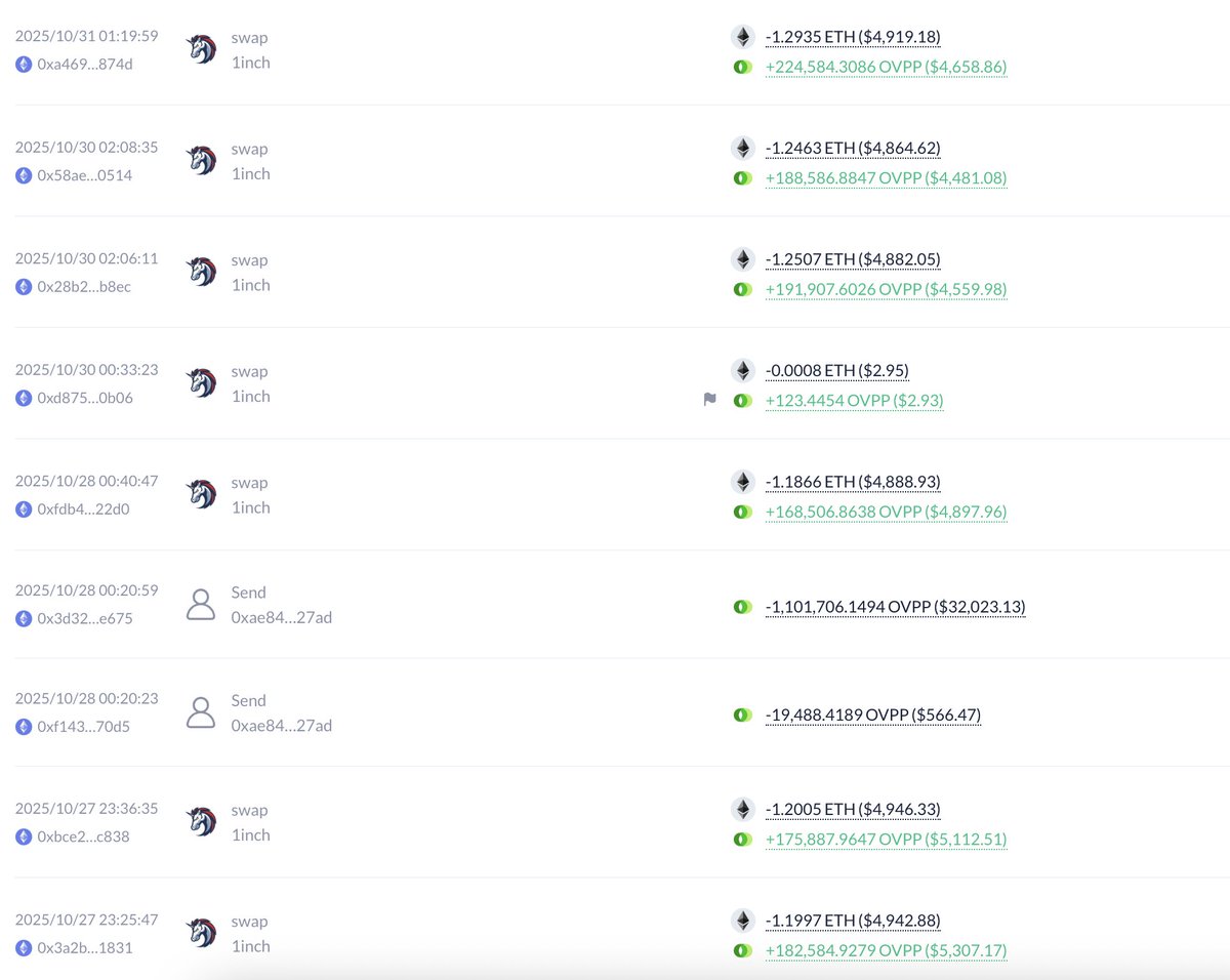 过去一个月,三头鲸鱼总共购买了1700万$OVPP(37.5万美元)。鲸鱼0xaca5,持有超过1000万美元的资产,从MEXC和DEXs购买了760万$OVPP(16.5万美元)。0xae84购买了543万$OVPP(11.7万美元)。0x3bd5购买了397万$OVPP(8.7万美元)。钱包地址:0xaca50a3a37d6f2ba49a9f9e3be949c342ac4b8a7 0xae84d81a8e74e5040a62300c66eb2181e38227ad 0x3bd532ff803378e651d456cee741e0d858d265fa