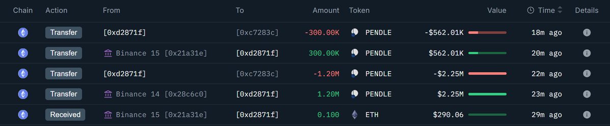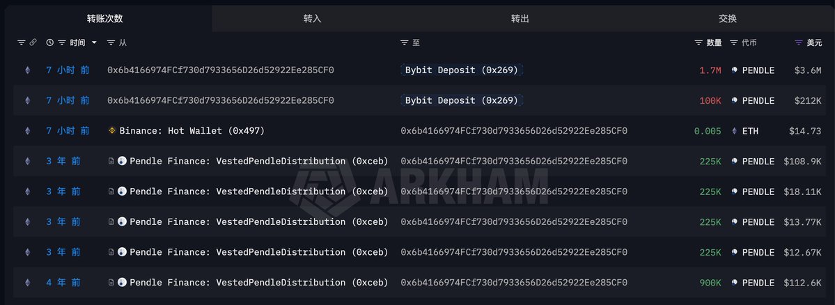 ◎前天,0x6b4...CF0 地址把 3 年前解锁归属的 180 万枚 PENDLE ($383 万) 转进 Bybit;