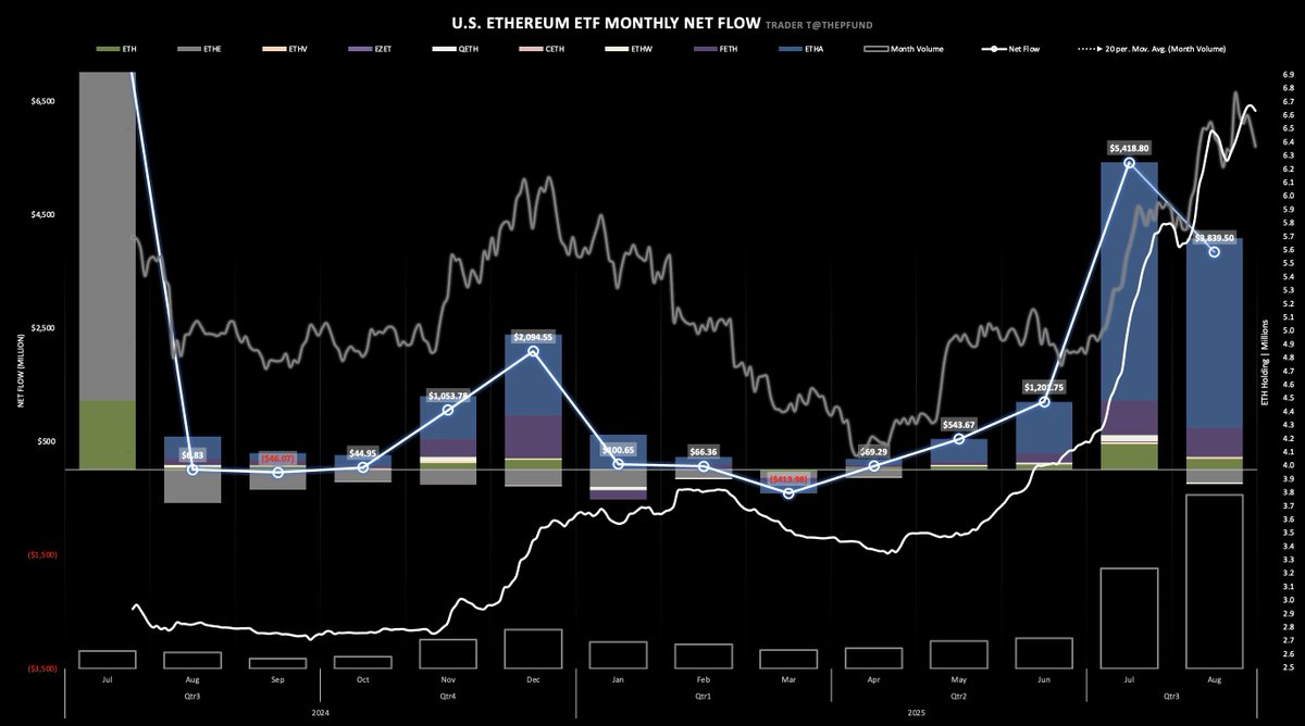2025/8 以太坊ETF月度净流入:38亿美元(+80万ETH)