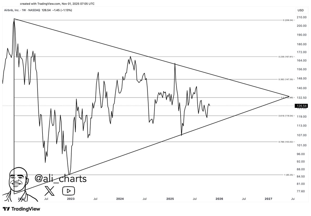 Airbnb $ABNB 在一个多年的三角形内进行整合!突破 $150 可能会触发上升势头,而跌破 $120 将使该设置失效。