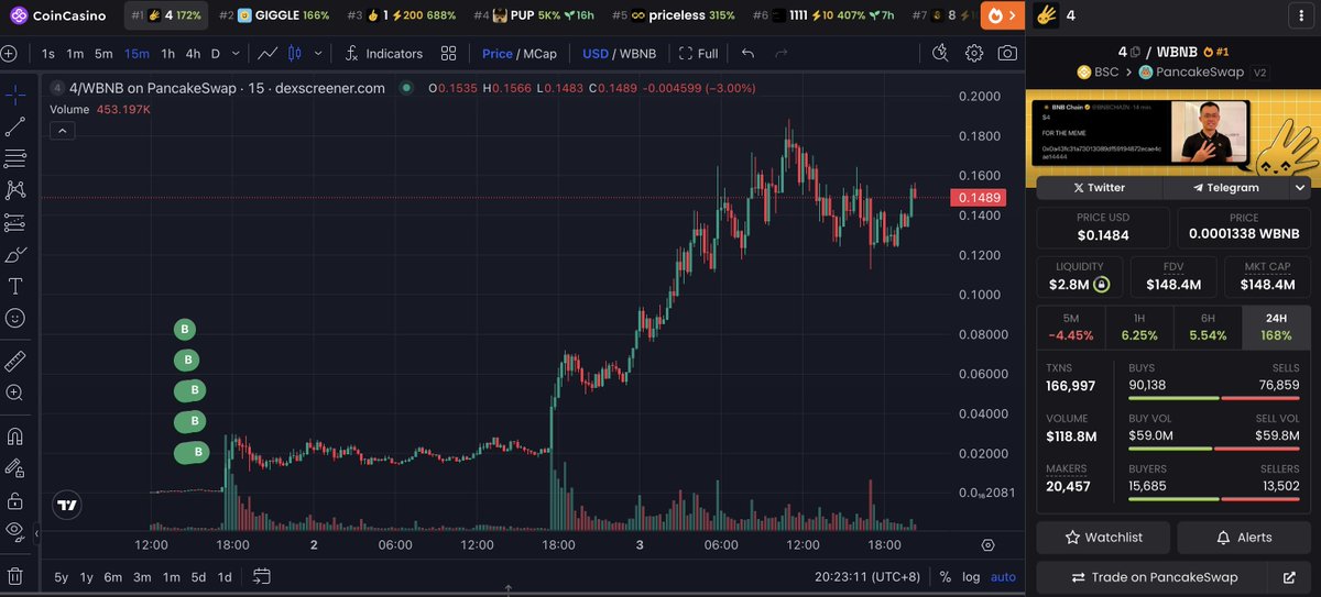 他两天前花费68 $BNB(6.87万美元)购买了63.07M $4,现在价值940万美元。