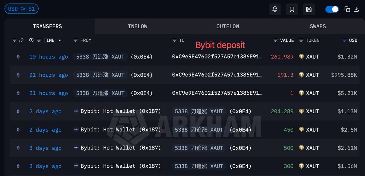 燃起来了,5338 刀追涨黄金的新地址继续加仓! 地址 0x0E4…4927E 5 分钟前再次从 #Bybit 提出 204.28 $XAUT ,价值 113 万美元;从昨天起他已追高买入 1454.28 枚 XAUT(780.2 万美元),平均成本约 $5365,目前浮盈 23 万美元