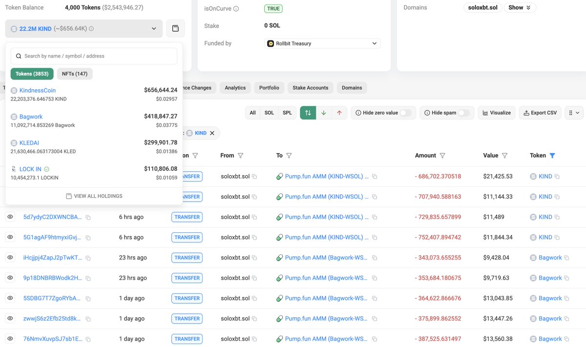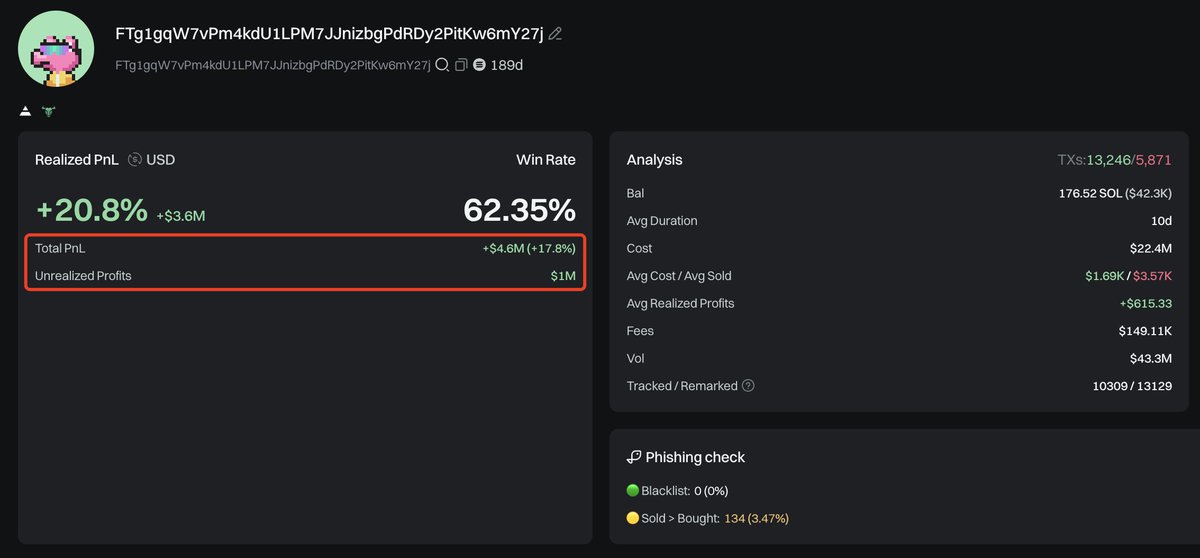 认识传奇的链上交易员soloxbt.sol,他在$KIND上获利702K美元,回报率高达101倍,并在$Bagwork上获利762K美元,回报率高达174倍。他的链上总利润高达460万美元。他花费了34.3 $SOL(6,942美元)购买了25.08M $KIND,卖出了2.88M $KIND获得218.8 $SOL(52.8K美元),还剩下22.2M $KIND(656.6K美元)。他花费了19.6 $SOL(4,377美元)购买了23.87M $Bagwork,卖出了12.78M $Bagwork获得1,420 $SOL(347.6K美元),还剩下11.09M $Bagwork(418.8K美元)。地址: