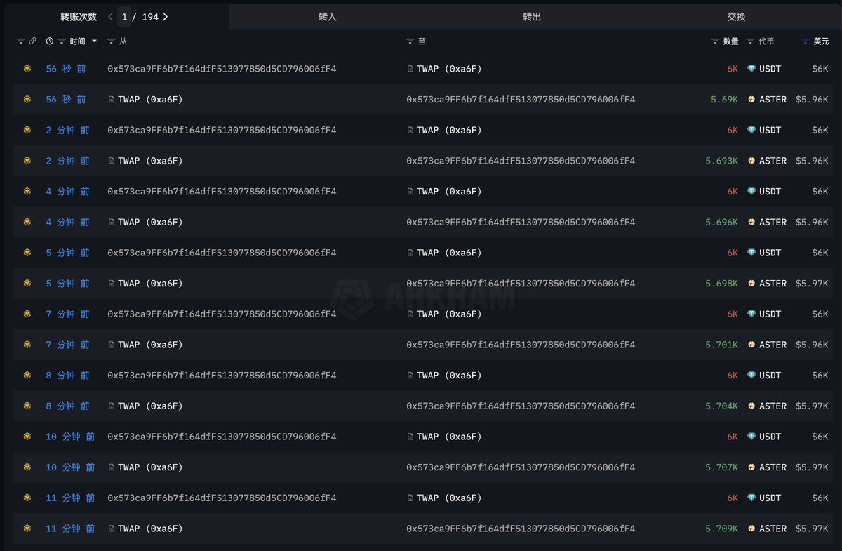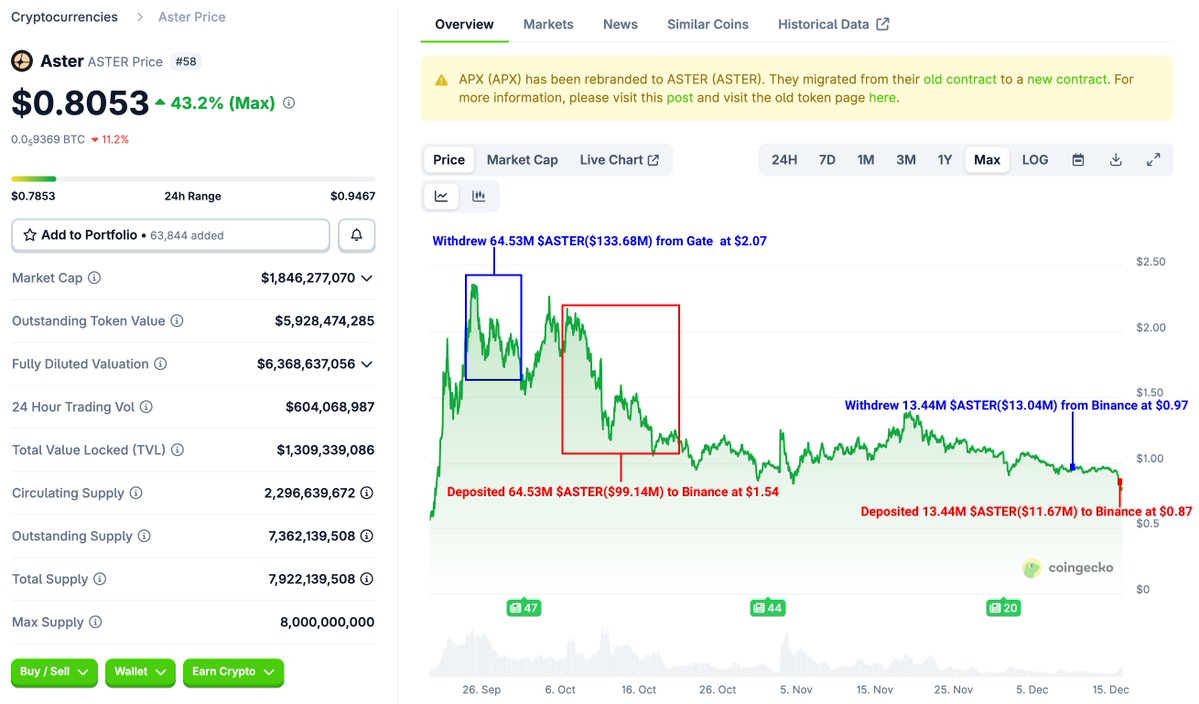 Lookonchain发现这条巨鲸将1344万ASTER转回币安(目前价值1167万美元,买入时1304万美元),锁定137万美元的亏损。