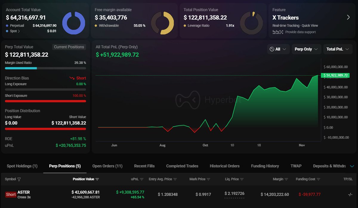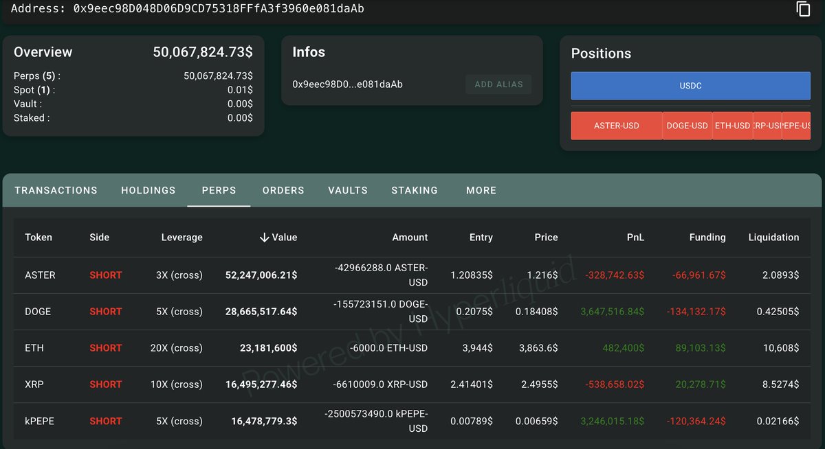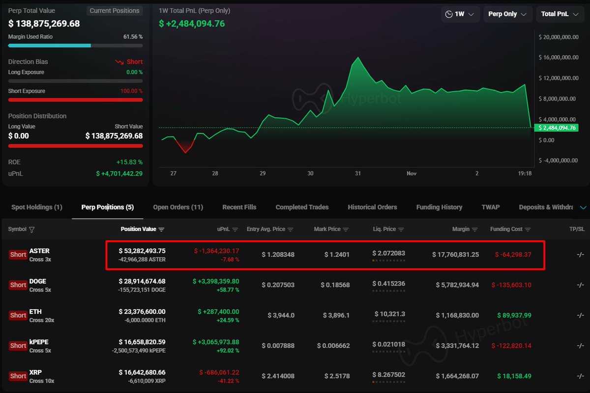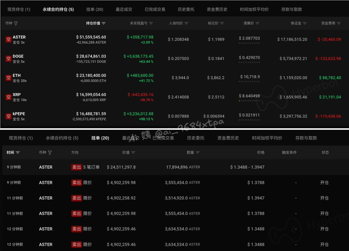 - 钱包 "0x9ee" 存入1330万美元开立$ASTER空头仓位,目前价值约5200万美元,并有一个未完成的订单以进一步增加仓位。