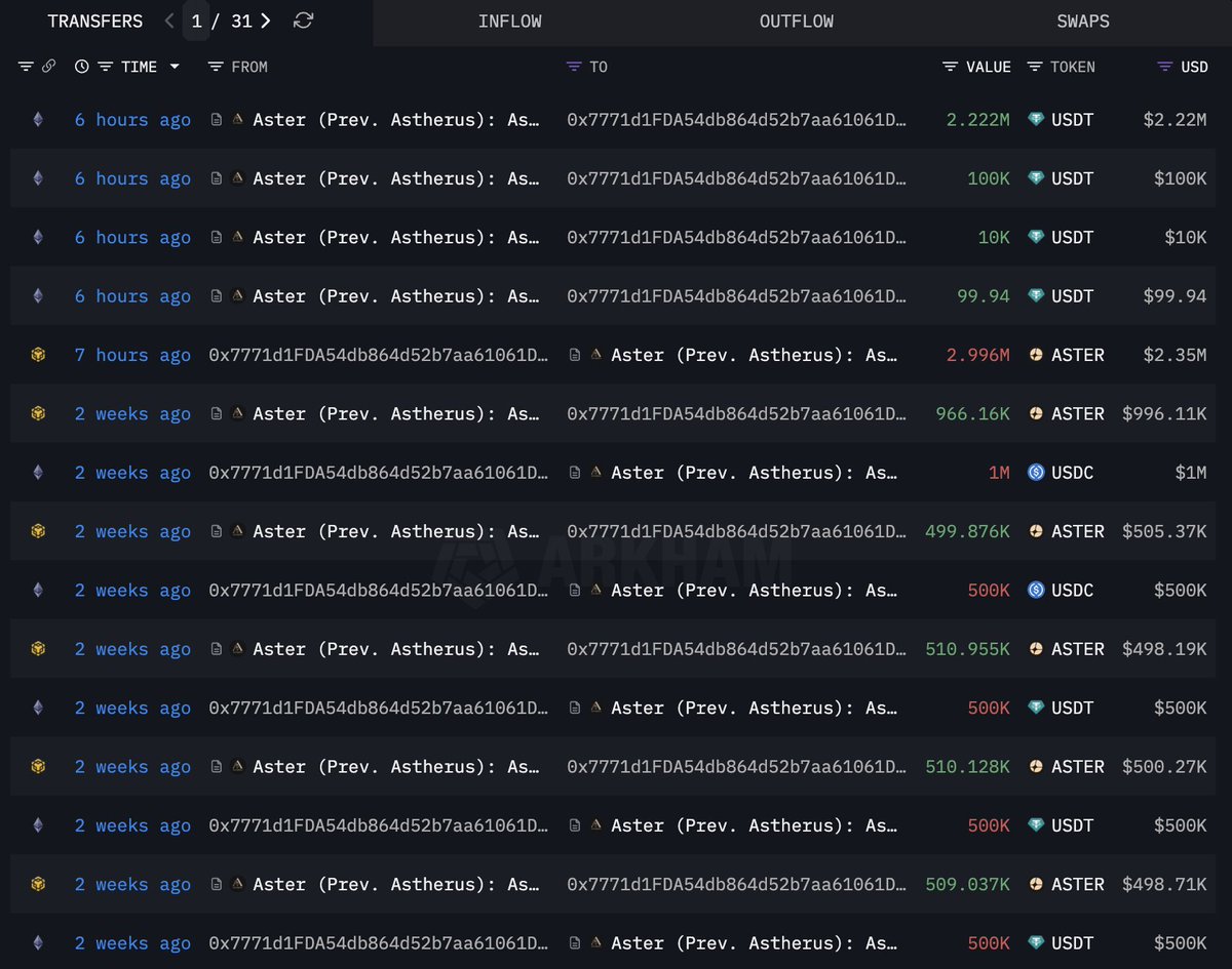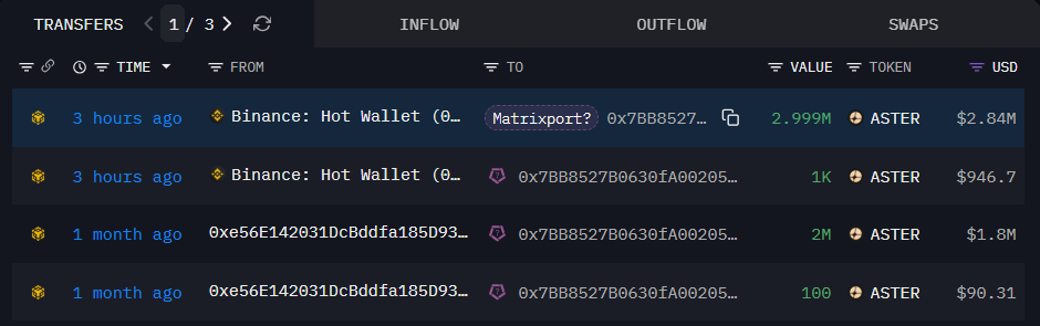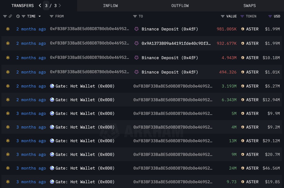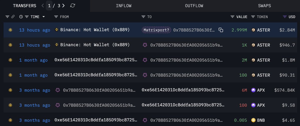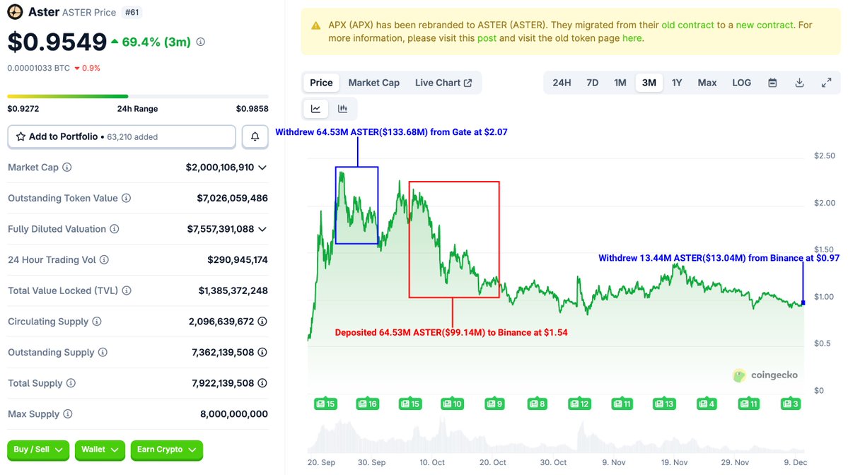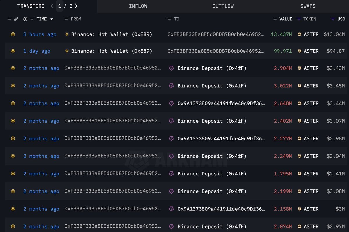 9 小时前该地址再次从 #Binance 提出 1243 万枚 ASTER,价值 1304 万美元,提出价格 $0.9705,看样子是重新开始囤币了🤔